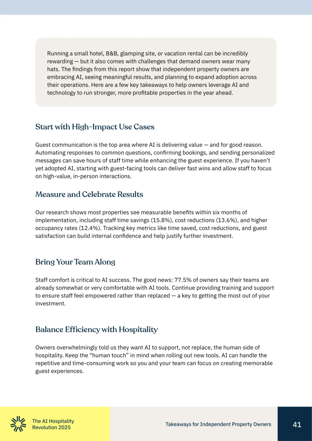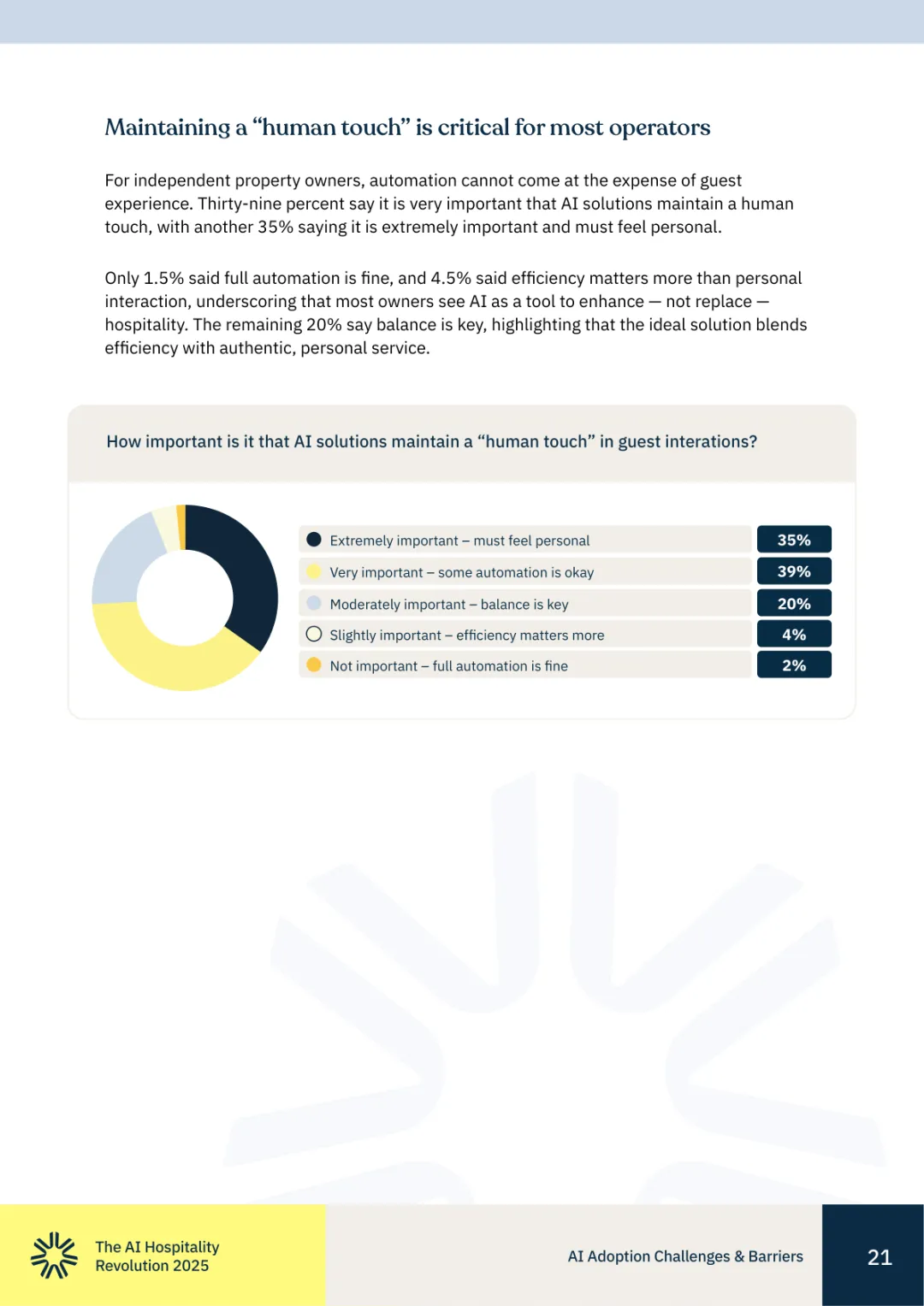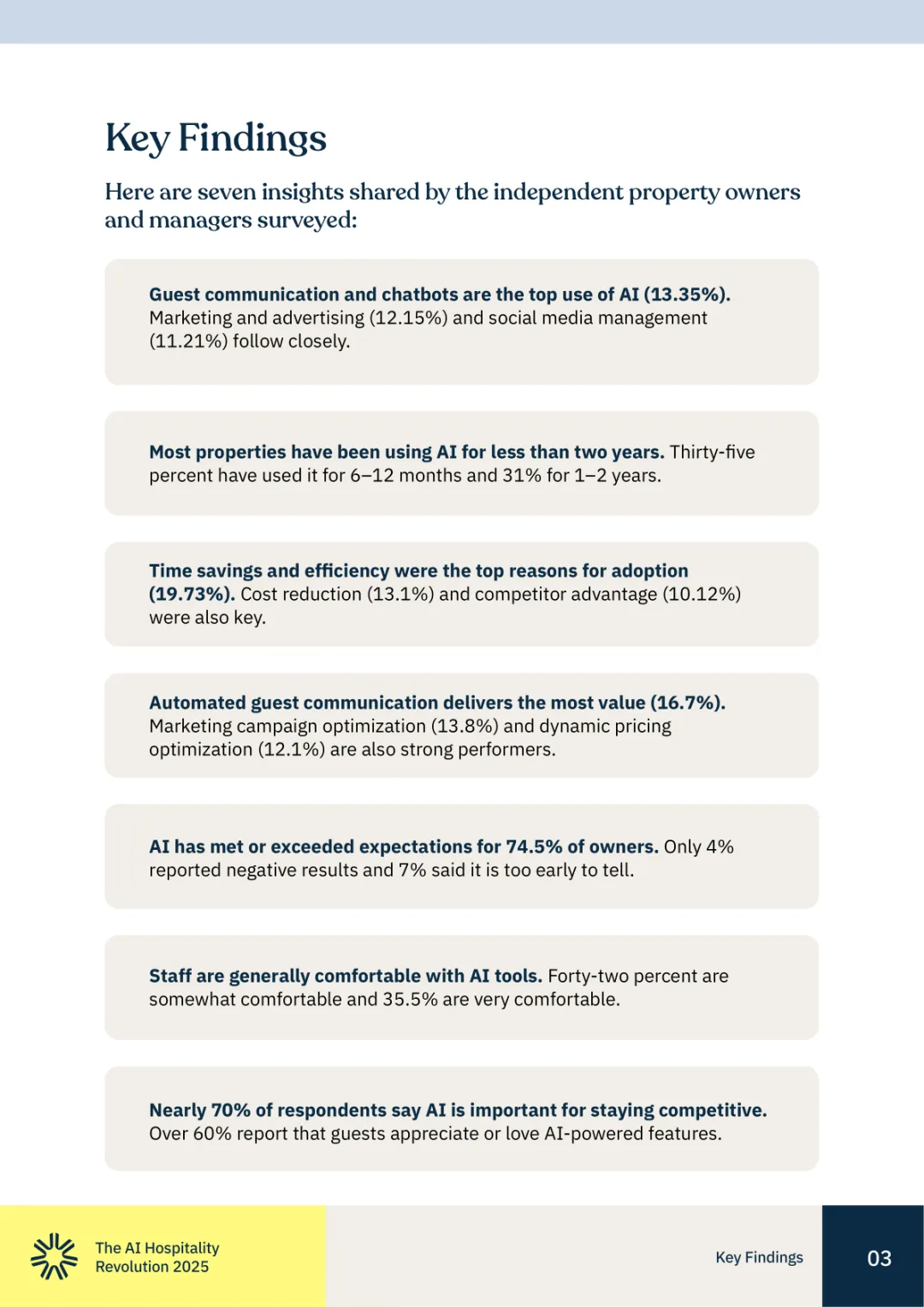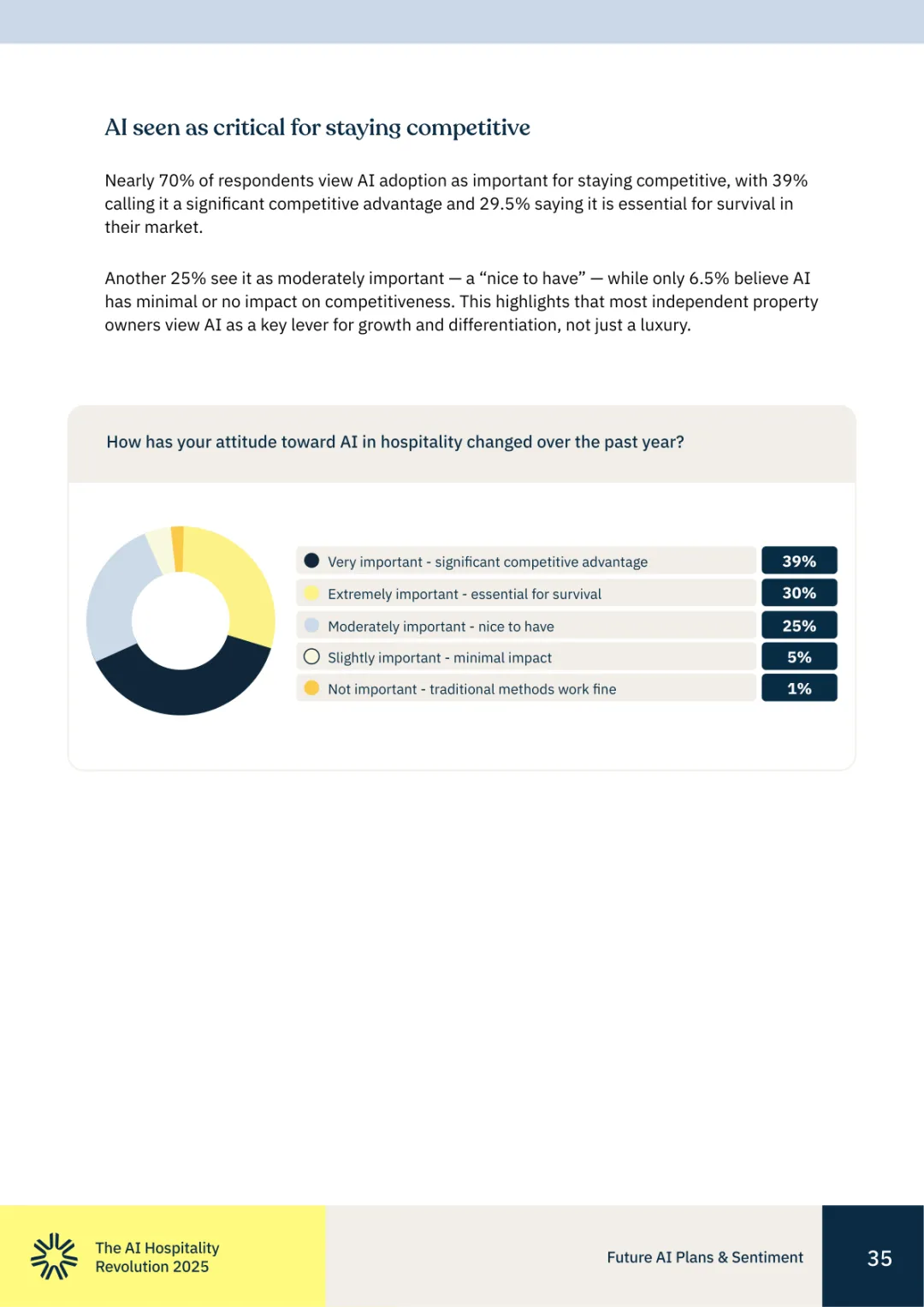 导读:2025 年酒店业人工智能革命研究报告基于对 200 名独立住宿业态经营者的调研,展现了 AI 在行业的落地现状与发展趋势。调研对象涵盖度假租赁、民宿、精品酒店等多种类型,超七成经营者使用 AI 不足两年,行业整体处于 AI 应用初期。AI 在客群沟通、营销推广、社媒运营等客面场景应用最广泛,节省时间与提升效率是经营者引入 AI 的核心动因,自动化客群沟通也成为创造价值最高的 AI 应用方向,超七成经营者表示 AI 效果达到或超出预期,员工对 AI 工具的接受度也处于较高水平。行业在 AI 落地中仍面临技术专业度不足、员工培训难度大、系统融合不畅等问题,经营者也担忧技术会削弱服务的人文属性,同时对数据安全存在顾虑。不过 AI 已为行业带来切实回报,超八成经营者实现营收增长,且多数能在半年内看到应用效果。未来经营者计划重点布局智能能源管理、客群沟通自动化等领域,近七成认为 AI 是保持竞争力的关键,行业对 AI 的整体预期积极,多数预判五年内超半数独立住宿业态将实现 AI 化运营。