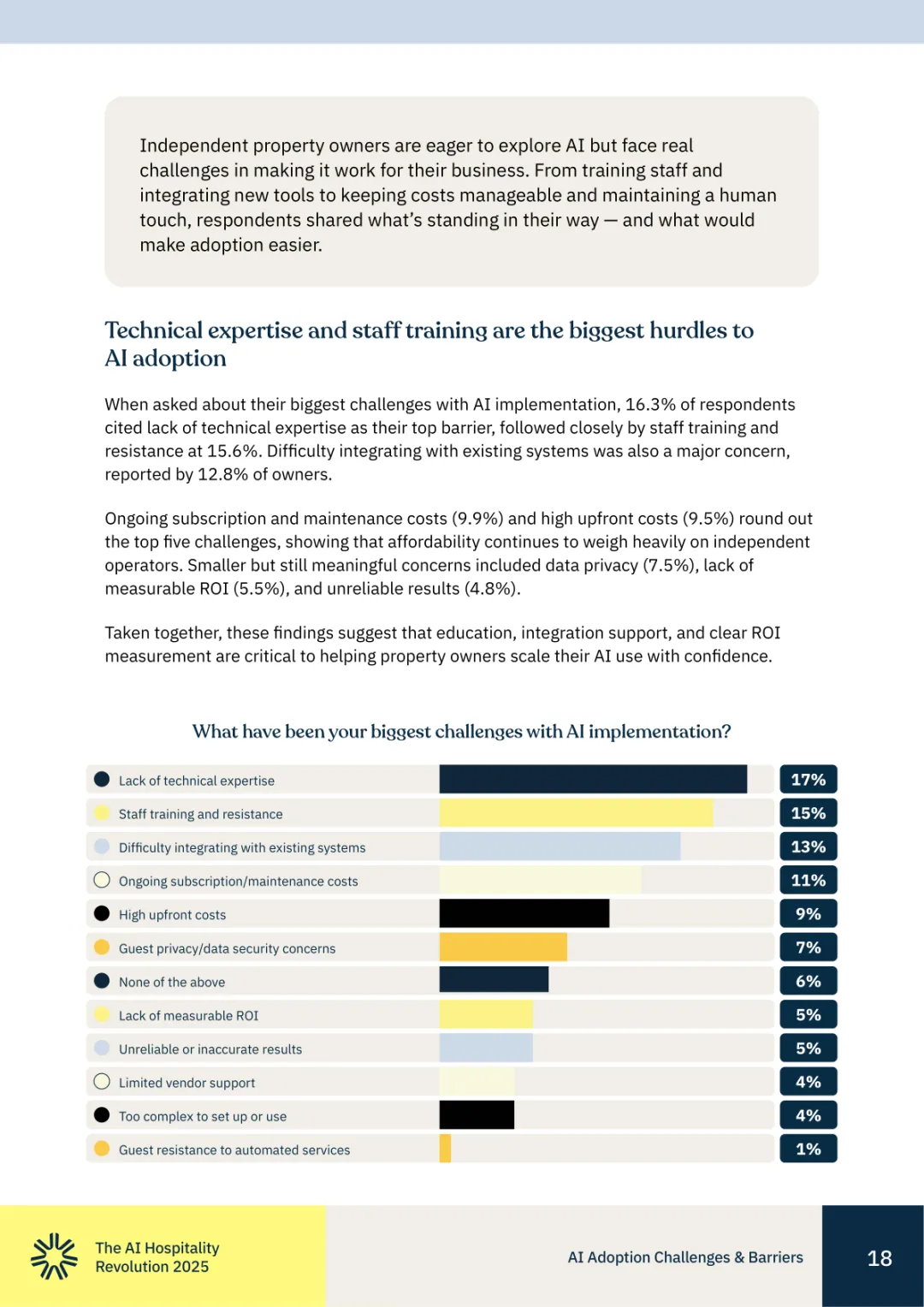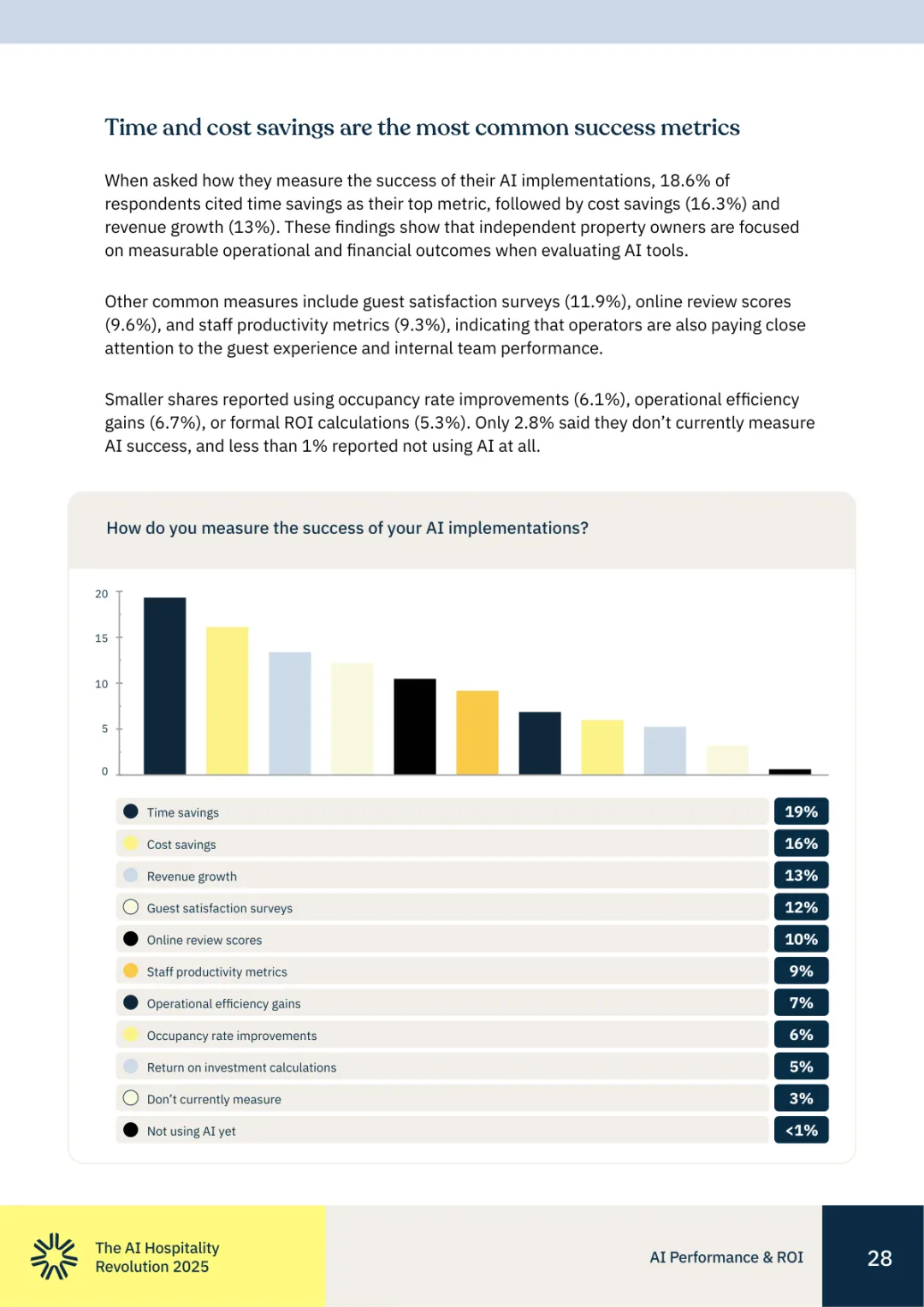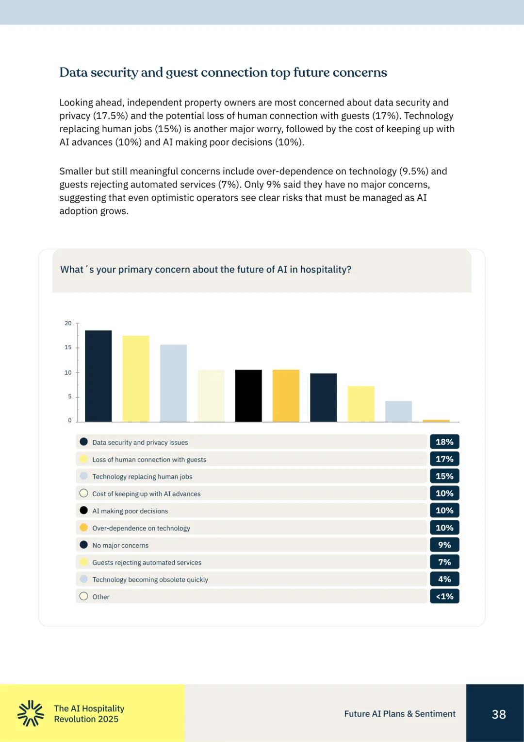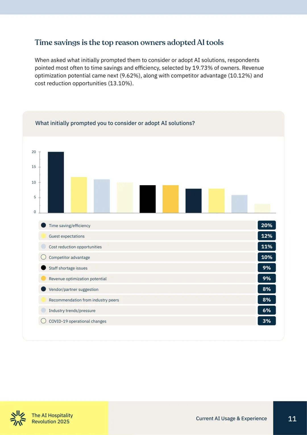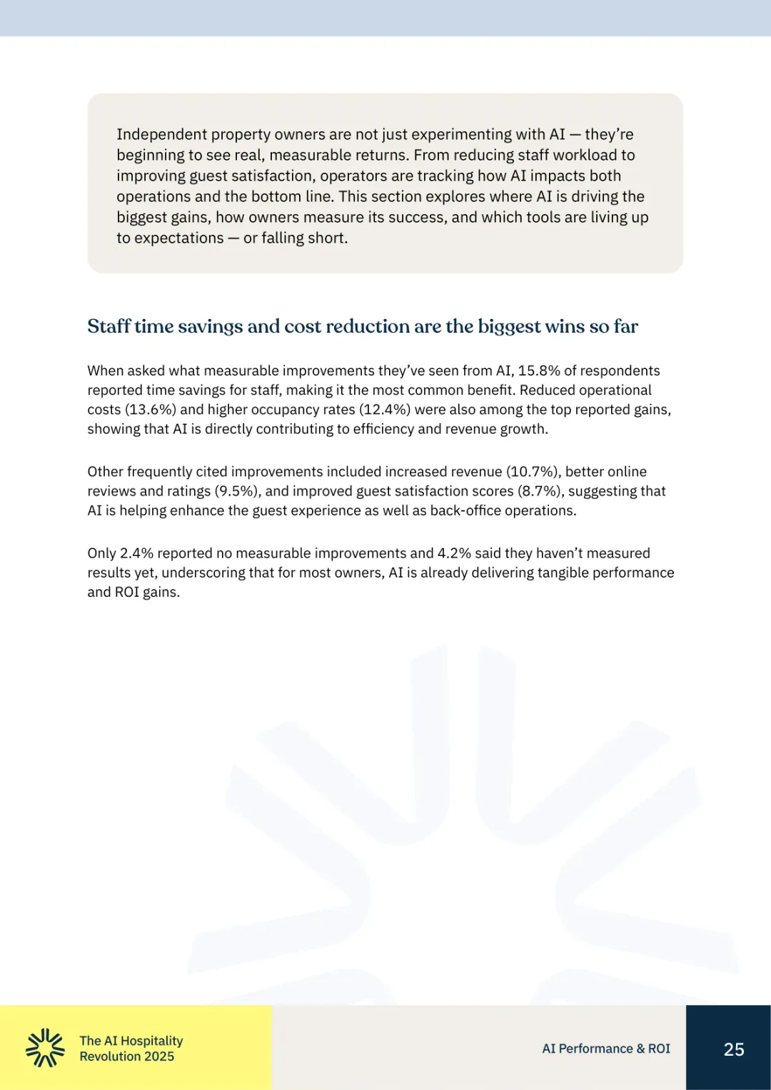 导读:2025 年酒店业人工智能革命研究报告基于对 200 名独立住宿业态经营者的调研,展现了 AI 在行业的落地现状与发展趋势。调研对象涵盖度假租赁、民宿、精品酒店等多种类型,超七成经营者使用 AI 不足两年,行业整体处于 AI 应用初期。AI 在客群沟通、营销推广、社媒运营等客面场景应用最广泛,节省时间与提升效率是经营者引入 AI 的核心动因,自动化客群沟通也成为创造价值最高的 AI 应用方向,超七成经营者表示 AI 效果达到或超出预期,员工对 AI 工具的接受度也处于较高水平。行业在 AI 落地中仍面临技术专业度不足、员工培训难度大、系统融合不畅等问题,经营者也担忧技术会削弱服务的人文属性,同时对数据安全存在顾虑。不过 AI 已为行业带来切实回报,超八成经营者实现营收增长,且多数能在半年内看到应用效果。未来经营者计划重点布局智能能源管理、客群沟通自动化等领域,近七成认为 AI 是保持竞争力的关键,行业对 AI 的整体预期积极,多数预判五年内超半数独立住宿业态将实现 AI 化运营。