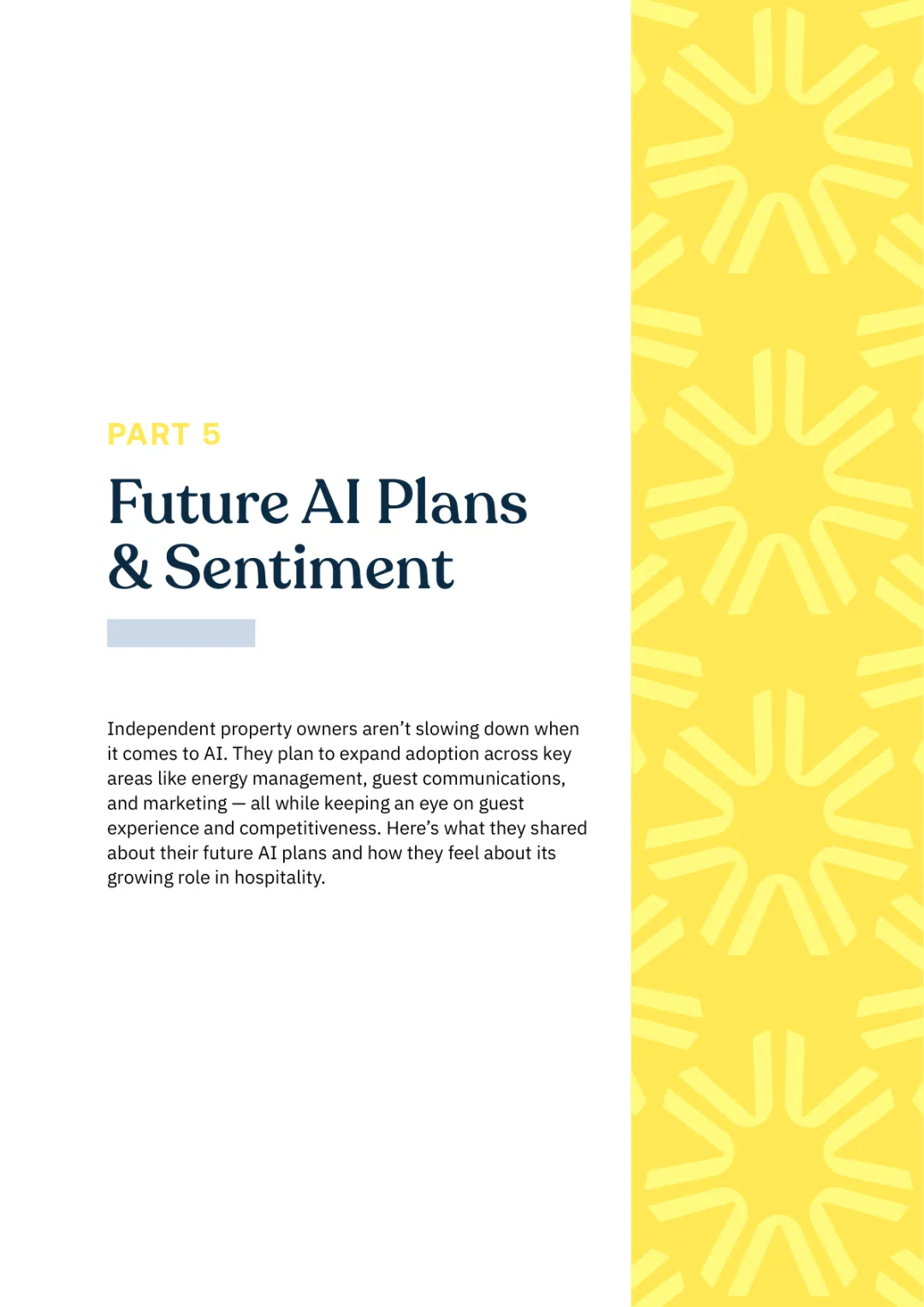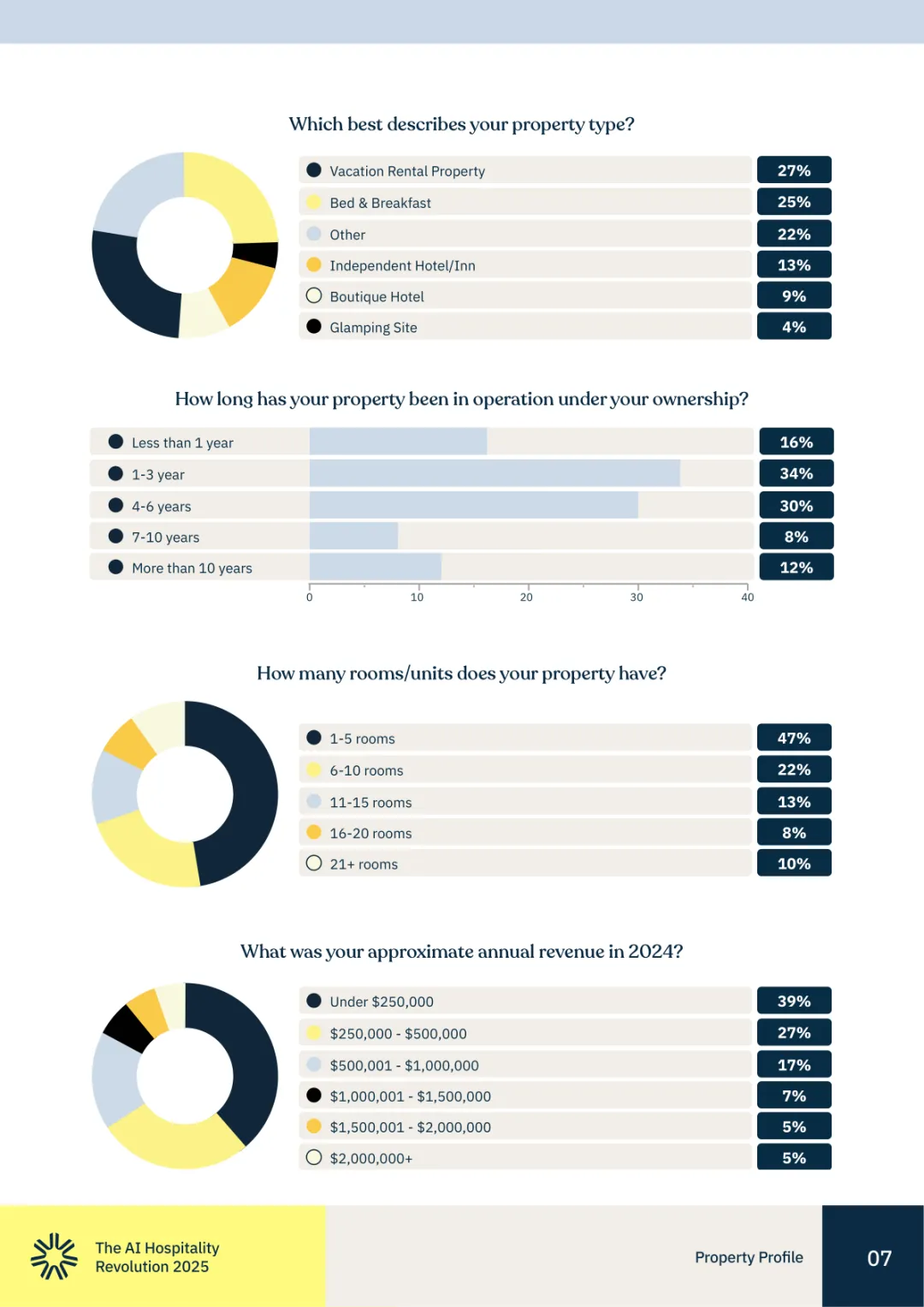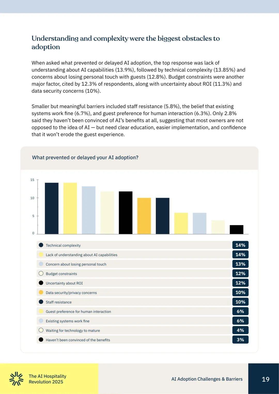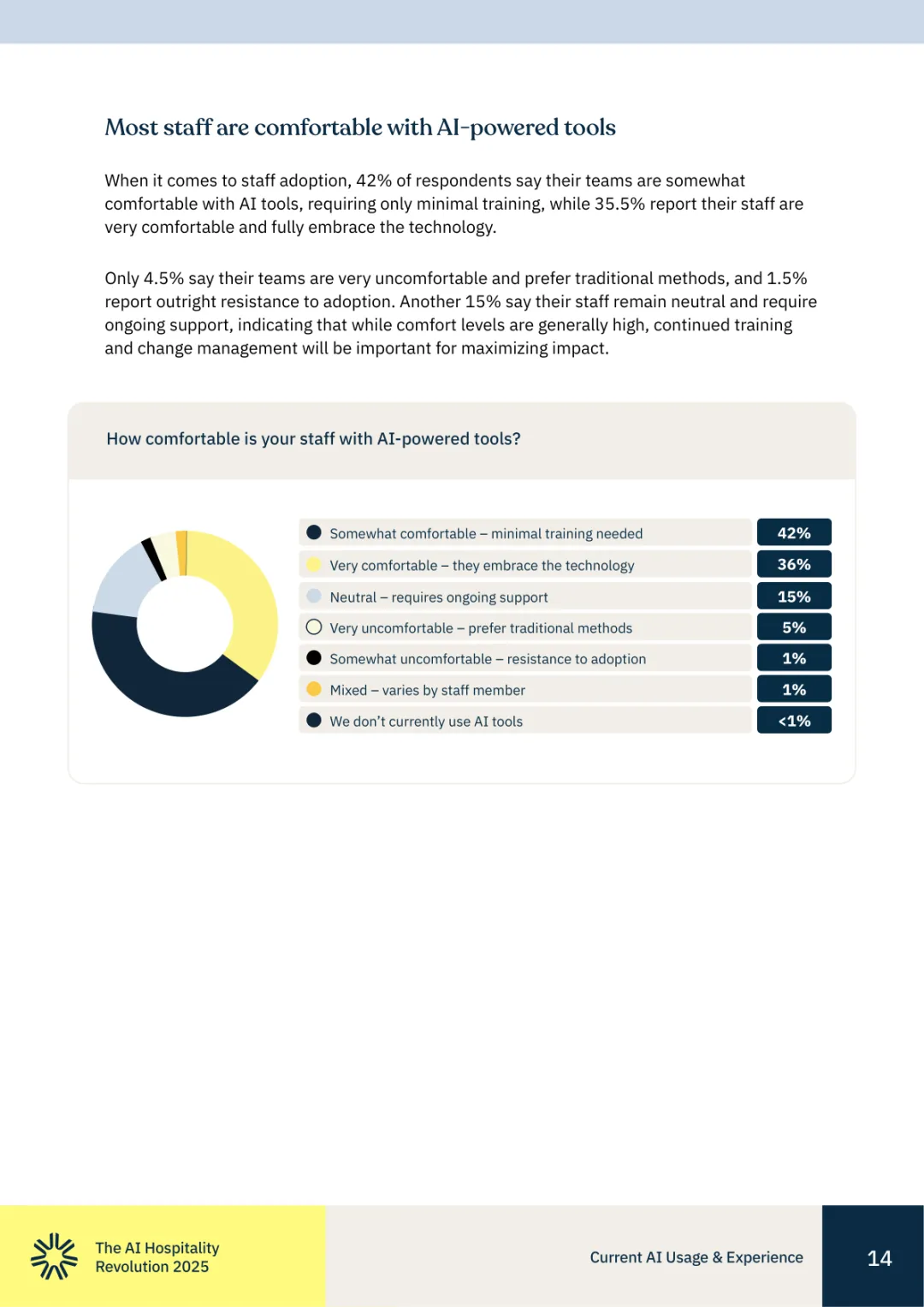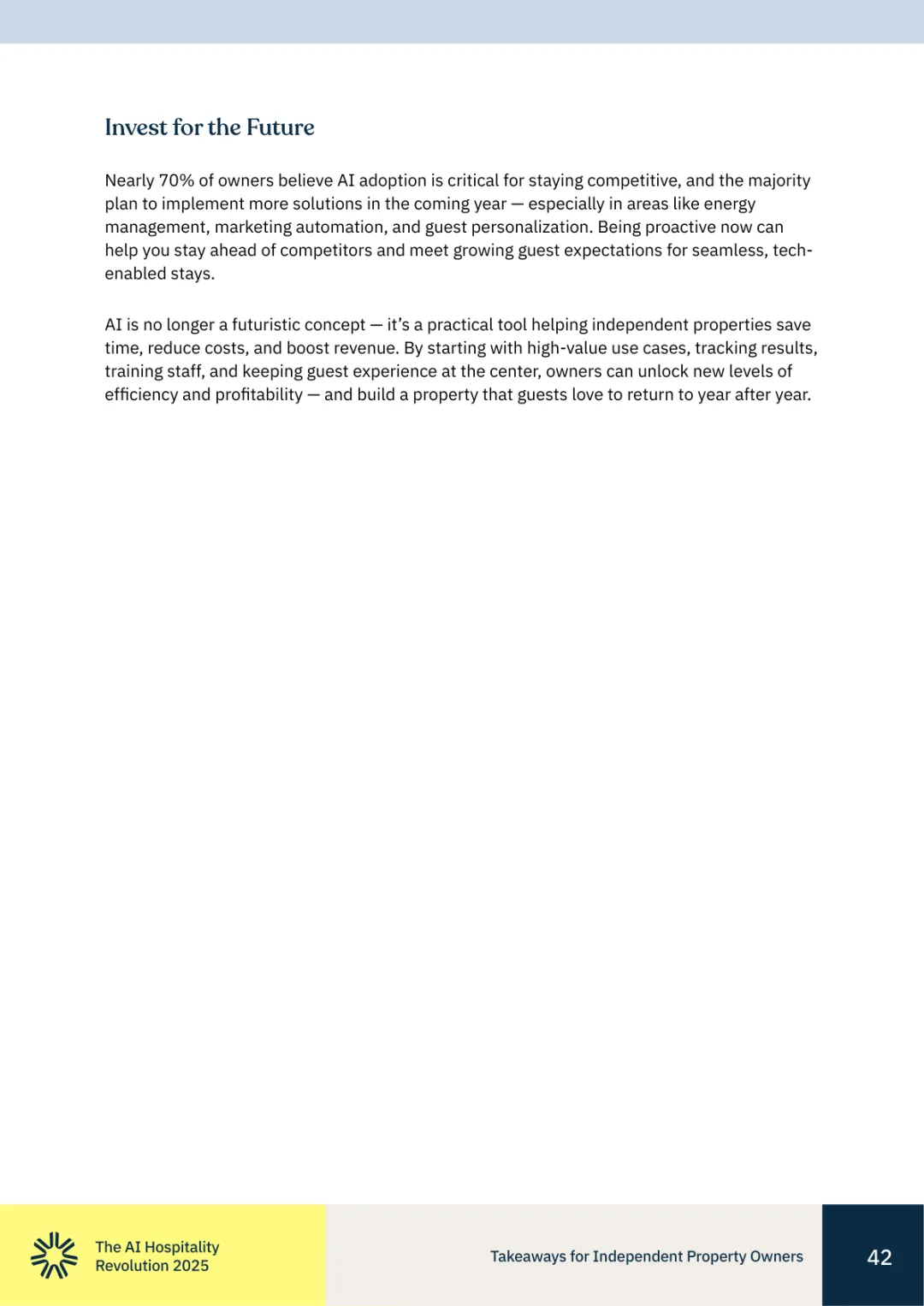 导读:2025 年酒店业人工智能革命研究报告基于对 200 名独立住宿业态经营者的调研,展现了 AI 在行业的落地现状与发展趋势。调研对象涵盖度假租赁、民宿、精品酒店等多种类型,超七成经营者使用 AI 不足两年,行业整体处于 AI 应用初期。AI 在客群沟通、营销推广、社媒运营等客面场景应用最广泛,节省时间与提升效率是经营者引入 AI 的核心动因,自动化客群沟通也成为创造价值最高的 AI 应用方向,超七成经营者表示 AI 效果达到或超出预期,员工对 AI 工具的接受度也处于较高水平。行业在 AI 落地中仍面临技术专业度不足、员工培训难度大、系统融合不畅等问题,经营者也担忧技术会削弱服务的人文属性,同时对数据安全存在顾虑。不过 AI 已为行业带来切实回报,超八成经营者实现营收增长,且多数能在半年内看到应用效果。未来经营者计划重点布局智能能源管理、客群沟通自动化等领域,近七成认为 AI 是保持竞争力的关键,行业对 AI 的整体预期积极,多数预判五年内超半数独立住宿业态将实现 AI 化运营。