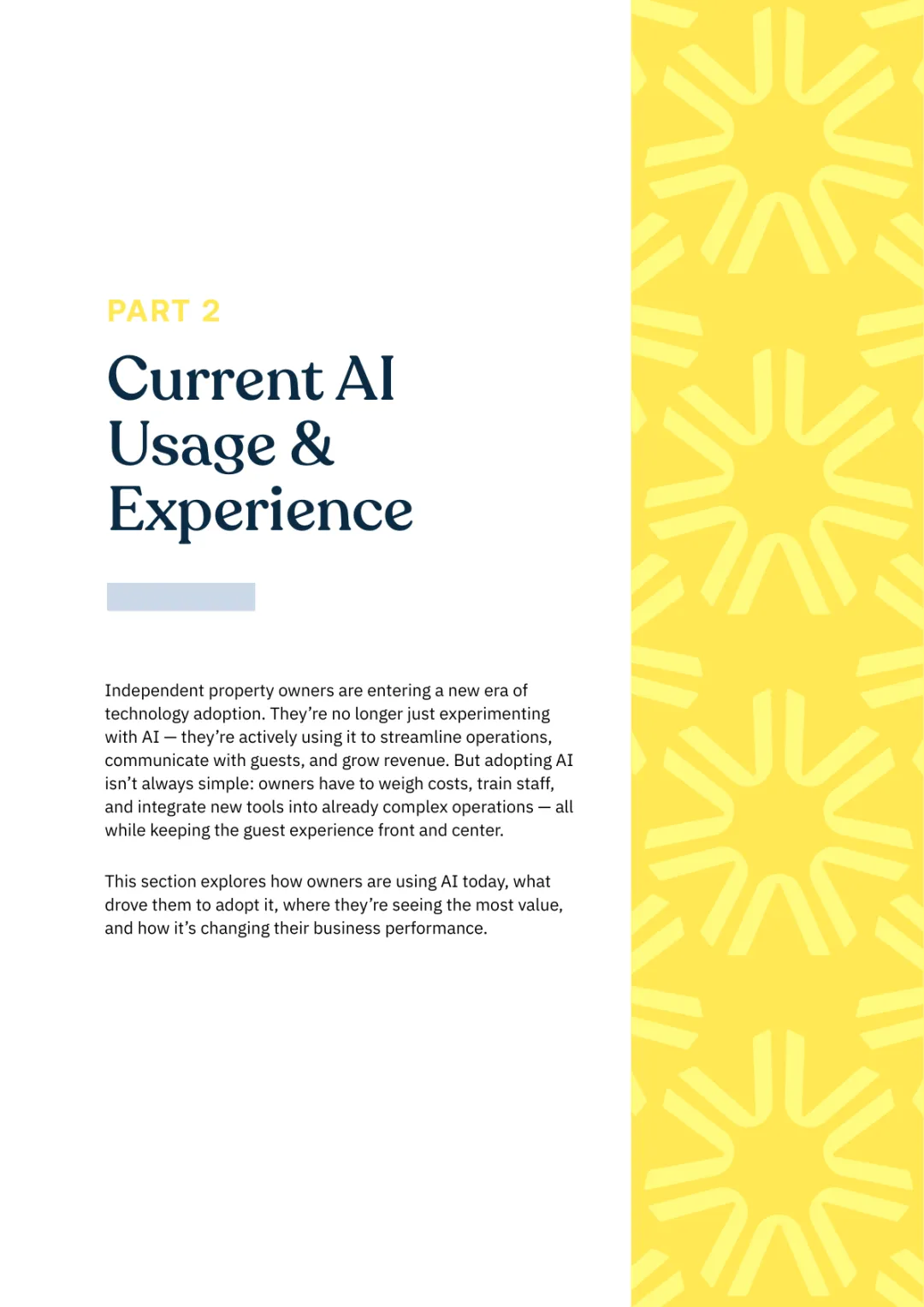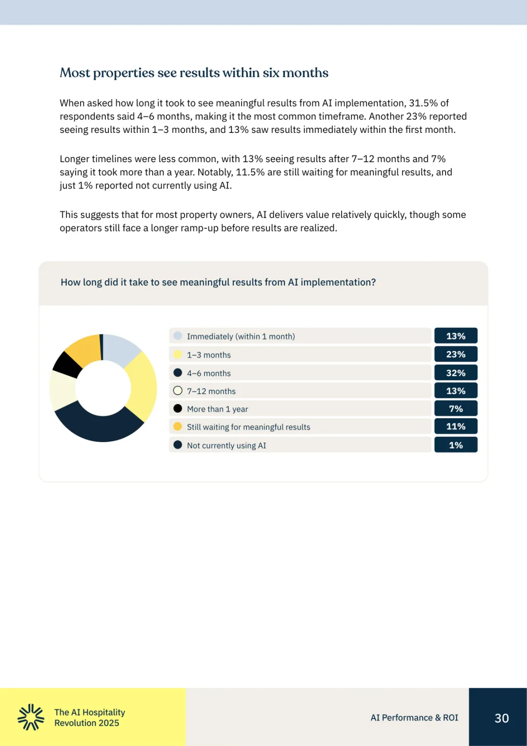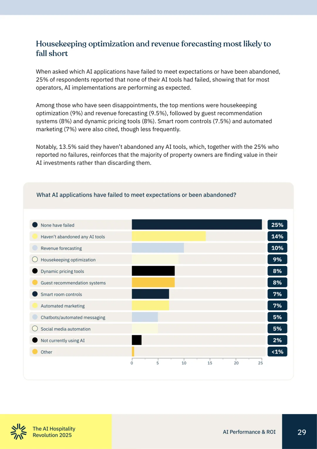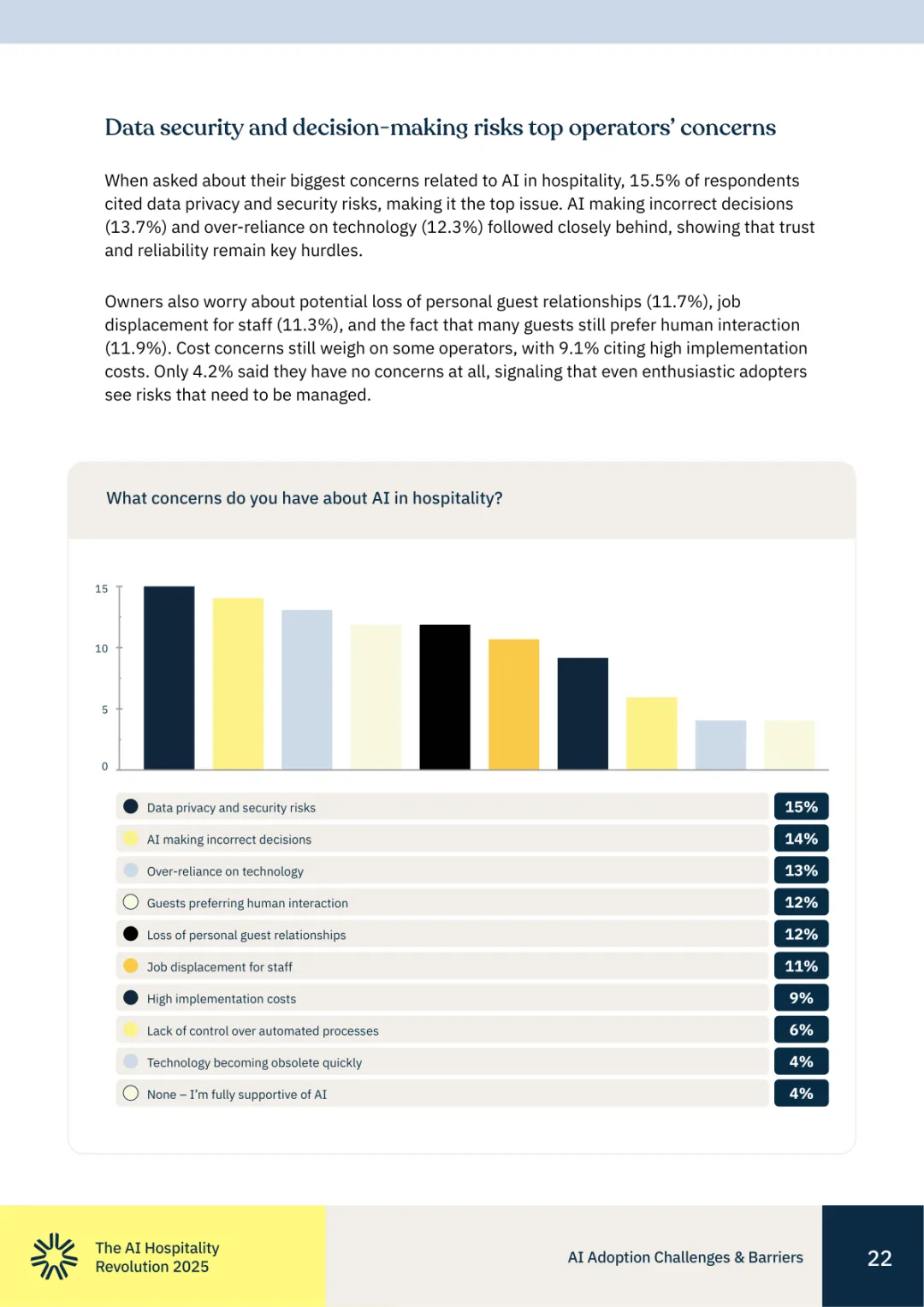 导读:2025 年酒店业人工智能革命研究报告基于对 200 名独立住宿业态经营者的调研,展现了 AI 在行业的落地现状与发展趋势。调研对象涵盖度假租赁、民宿、精品酒店等多种类型,超七成经营者使用 AI 不足两年,行业整体处于 AI 应用初期。AI 在客群沟通、营销推广、社媒运营等客面场景应用最广泛,节省时间与提升效率是经营者引入 AI 的核心动因,自动化客群沟通也成为创造价值最高的 AI 应用方向,超七成经营者表示 AI 效果达到或超出预期,员工对 AI 工具的接受度也处于较高水平。行业在 AI 落地中仍面临技术专业度不足、员工培训难度大、系统融合不畅等问题,经营者也担忧技术会削弱服务的人文属性,同时对数据安全存在顾虑。不过 AI 已为行业带来切实回报,超八成经营者实现营收增长,且多数能在半年内看到应用效果。未来经营者计划重点布局智能能源管理、客群沟通自动化等领域,近七成认为 AI 是保持竞争力的关键,行业对 AI 的整体预期积极,多数预判五年内超半数独立住宿业态将实现 AI 化运营。