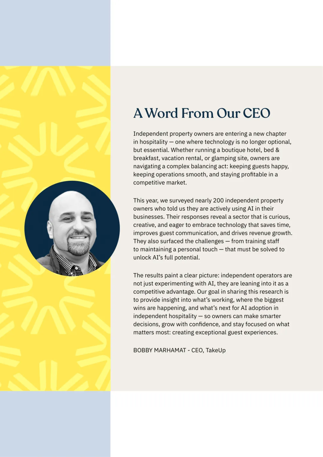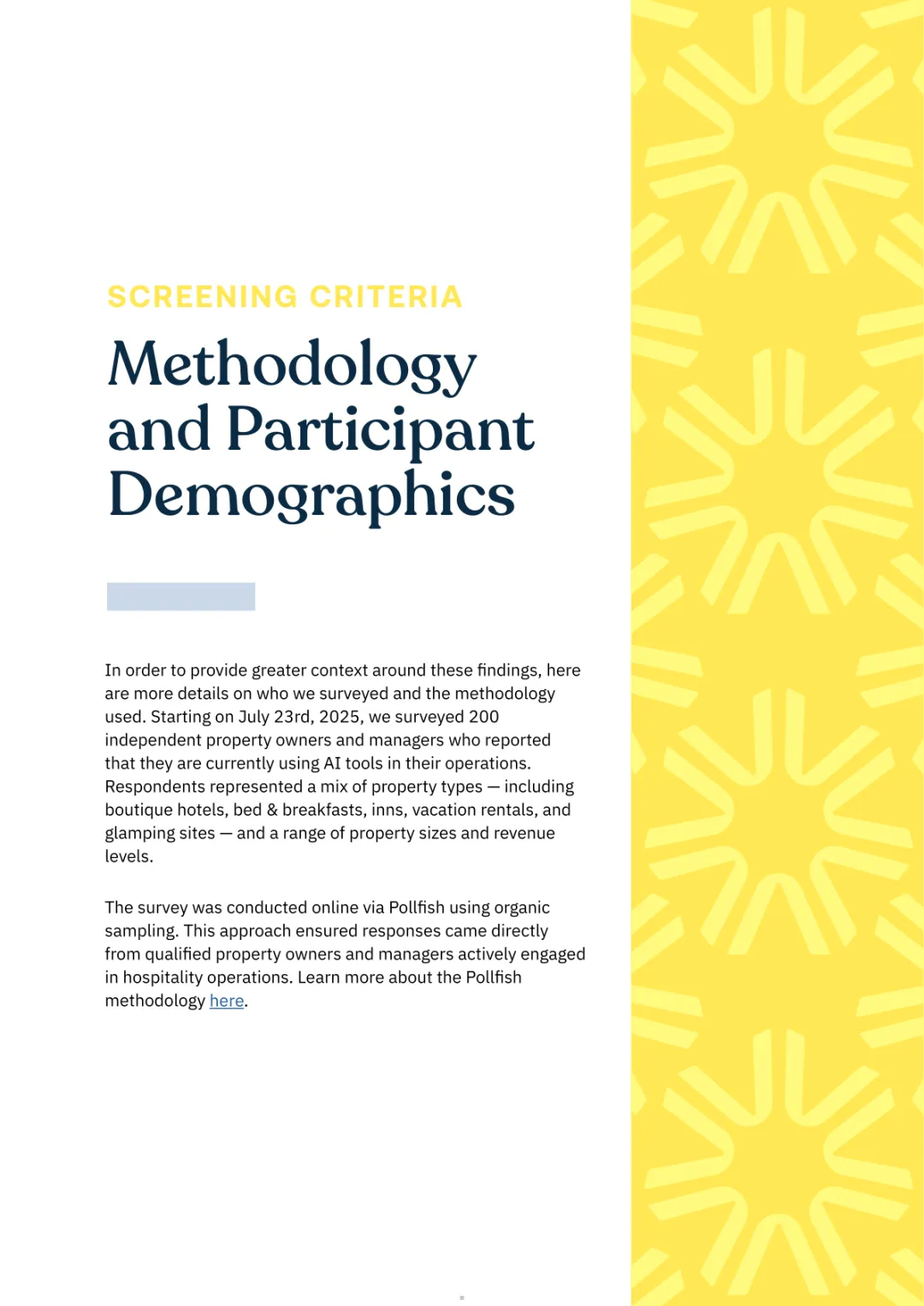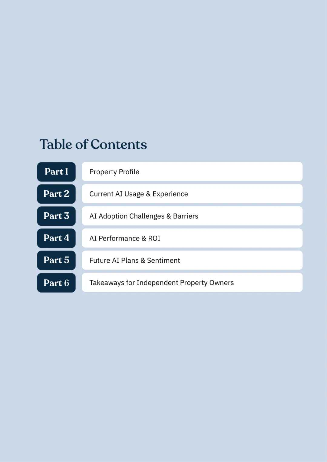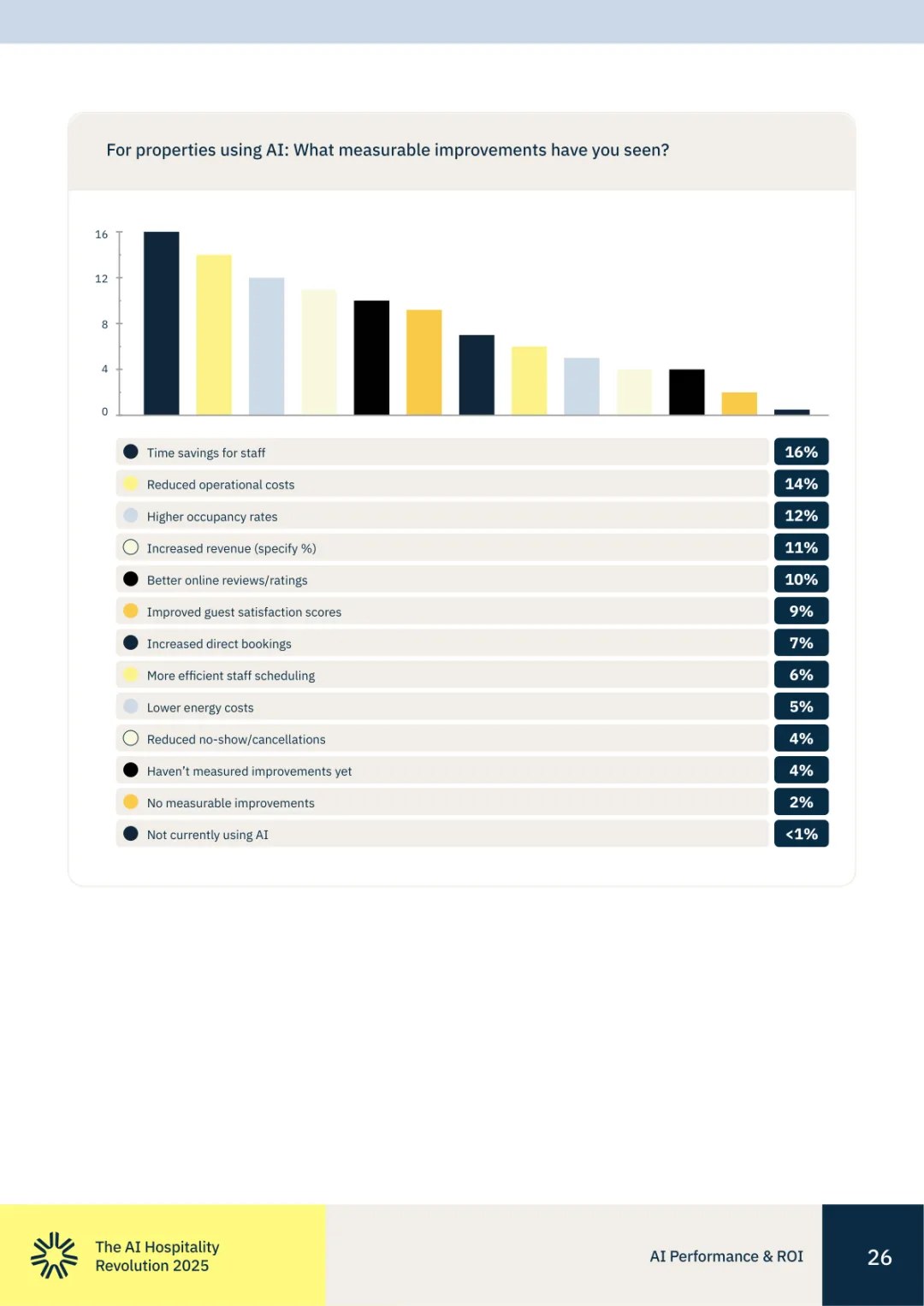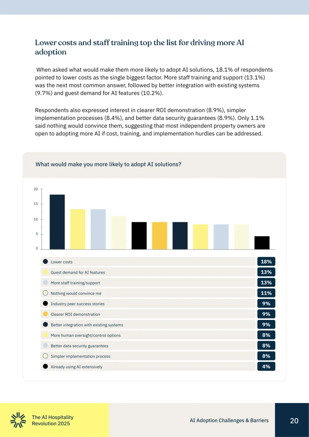 导读:2025 年酒店业人工智能革命研究报告基于对 200 名独立住宿业态经营者的调研,展现了 AI 在行业的落地现状与发展趋势。调研对象涵盖度假租赁、民宿、精品酒店等多种类型,超七成经营者使用 AI 不足两年,行业整体处于 AI 应用初期。AI 在客群沟通、营销推广、社媒运营等客面场景应用最广泛,节省时间与提升效率是经营者引入 AI 的核心动因,自动化客群沟通也成为创造价值最高的 AI 应用方向,超七成经营者表示 AI 效果达到或超出预期,员工对 AI 工具的接受度也处于较高水平。行业在 AI 落地中仍面临技术专业度不足、员工培训难度大、系统融合不畅等问题,经营者也担忧技术会削弱服务的人文属性,同时对数据安全存在顾虑。不过 AI 已为行业带来切实回报,超八成经营者实现营收增长,且多数能在半年内看到应用效果。未来经营者计划重点布局智能能源管理、客群沟通自动化等领域,近七成认为 AI 是保持竞争力的关键,行业对 AI 的整体预期积极,多数预判五年内超半数独立住宿业态将实现 AI 化运营。