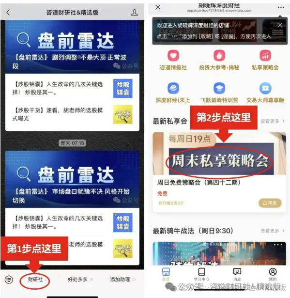 (2)点击本公众号菜单栏—点击财研社—点击周末私享策略会即可收看(免费直播无回放,请及时观看)。