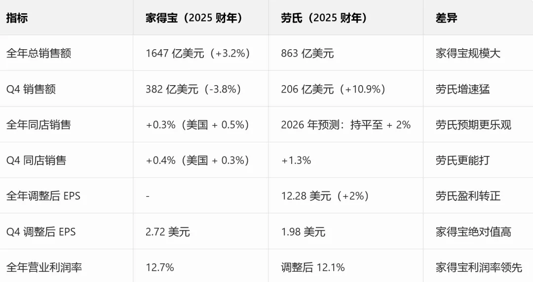 先看最直观的成绩单,家得宝体量还是老大,但劳氏增速更猛,同店表现也更亮眼。