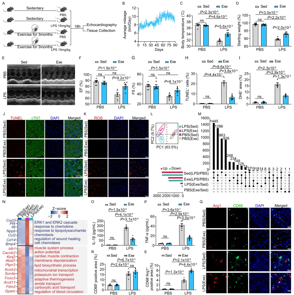 为评估规律体力运动对脓毒症心功能的影响,我们为小鼠提供跑轮进行自愿运动 3 个月。随后,向缺乏运动(Sed)与运动(Exe)组小鼠腹腔注射脂多糖(LPS)或等体积磷酸盐缓冲液(PBS),以模拟内毒素性脓毒性休克并诱导脓毒症诱导心肌病(SICM)(图 1A、B)。我们的观察显示,规律运动可抵御 LPS 诱导的脓毒症,其表现为注射后 18 h 体温与体重下降幅度减小(图 1C、D)。尽管 LPS 注射损害了缺乏运动小鼠的心功能,运动小鼠仍保持心功能相对完整,射血分数(EF)与缩短分数(FS)分别提高约 21% 与 34%(图 1E–G)。一致地,TUNEL 与二氢乙啶(DHE)染色显示,SICM 小鼠在运动条件下心脏细胞凋亡与氧化损伤减少(图 1H–K)。相反,在 PBS 对照组中,Sed 与 Exe 小鼠的体温、体重与心功能相当(图 1C–K)。综上,自愿跑轮可在脓毒症过程中维持心功能。