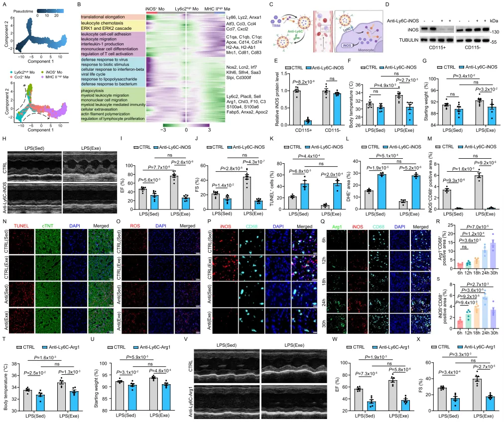 为阐明 iNOS⁺ 单核细胞在 SICM 中的作用,我们设计了一种靶向纳米抑制剂:利用小分子抑制剂 TRIM,特异性抑制 Ly6C⁺ 单核细胞中的 iNOS(图 4C)。TRIM 被包封于由 PEG-DSPE 与 DSPE-PEG-NHS 构建的脂质体核心,并在脂质体表面接枝靶向 Ly6C 的抗体以实现精准单核细胞靶向。该靶向纳米抑制剂呈单分散粒径分布,粒径为 93.12 nm,且具有规则球形形态(图 S6A–C)。其载药量与抗体接枝量分别为 38.53% 与 2.13%。此外,通过监测颗粒长期粒径变化评估其稳定性,结果显示随时间推移未见明显解体(图 S6D)。Western blot 分析证实该纳米颗粒可有效抑制单核细胞 iNOS 表达(图 4D、E)。与既往研究提示“心脏损伤早期缺乏炎症性巨噬细胞会导致凋亡心肌细胞累积并损害修复”³⁸–⁴¹一致,我们观察到抑制单核细胞 iNOS 可消除运动在脓毒症期间降低体温下降与体重丢失的有益效应(图 4F、G)。与此前一致,体力活动可维持心功能(图 4H–J);然而,抑制单核细胞 iNOS 会消除运动对脓毒症诱导心肌损伤的保护作用。有趣的是,与对照小鼠相比,在缺乏运动小鼠中抑制单核细胞 iNOS 甚至加重了 LPS 诱导的心功能障碍。该效应亦与运动小鼠中先前观察到的心肌细胞凋亡与氧化损伤下降被抵消相一致(图 4K–P)。进一步对 SICM 期间心脏巨噬细胞进行时间序列分析显示,巨噬细胞存在由 iNOS⁺ 向 Arg1⁺ 的转变(图 4Q–S),且运动似乎加速该转变(图 1Q–S 及图 4M、P–S)。为进一步研究 SICM 中单核细胞 Arg1 的作用,我们使用上述纳米颗粒特异性抑制 Ly6C⁺ 单核细胞中的 Arg1(图 4C 与图 S6E–G)。单核细胞 Arg1 抑制消除了运动在降低体温下降、体重丢失、IL-1β 与 TNF-α 水平以及脓毒症诱导心肌损伤方面的保护效应(图 4T–X 与图 S6H–K)。此外,先前观察到的心脏巨噬细胞由 iNOS⁺ 向 Arg1⁺ 加速转变也被单核细胞 Arg1 抑制所扰乱(图 S6L)。综上,这些结果表明,单核细胞来源巨噬细胞中 iNOS 与 Arg1 的表达共同参与 SICM 期间心功能保护,而运动可加速巨噬细胞由 iNOS⁺ 向 Arg1⁺ 的转变。图 4|规律运动诱导单核细胞来源的 iNOS⁺ 亚群以保护脓毒症心功能Monocle 预测的单核细胞-巨噬细胞发育轨迹,涵盖 Ly6c2^high Mo、Ccr2⁺ Mø、MHC II^high Mø 与 iNOS⁺ Mo(A)。基于 Monocle2 在拟时序中共享动力学特征的差异表达基因热图(B);每种模型对应的不同 GO 术语与代表性基因分别标示于左侧与右侧。用于特异性抑制单核细胞 iNOS 的纳米抑制剂示意图(C)。图由 BioRender 制作,Shang, M.(2025)lbdglen。通过 WB 检测纳米抑制剂对单核细胞 iNOS 的抑制效率(D、E)。β-Tubulin 作为上样内参。数字表示相对于 β-Tubulin 的灰度定量倍数变化。每组分析 6 份样本。缺乏运动(Sed;CTRL,n = 7;Anti-Ly6C-iNOS,n = 7)与运动(Exe;CTRL,n = 8;Anti-Ly6C-iNOS,n = 7)小鼠在腹腔注射 LPS 并给予 Anti-Ly6C-iNOS 或对照处理后 18 h 的体温(F)与体重变化百分比(G)。代表性超声心动图图像(H)及 LPS 腹腔注射后 18 h 的射血分数(EF%)(I)与缩短分数(FS%)(J)定量:Sed(CTRL,n = 7;Anti-Ly6C-iNOS,n = 7)与 Exe(CTRL,n = 8;Anti-Ly6C-iNOS,n = 7)小鼠均给予 Anti-Ly6C-iNOS 或对照处理。Sed 与 Exe 小鼠在 LPS 注射后 18 h,接受 Anti-Ly6C-iNOS 或对照(CTRL)处理的心脏中 TUNEL⁺ 细胞(N、K)、DHE⁺ 区域(O、L)以及 iNOS⁺CD68⁺ 细胞(P、M)的代表性图像与定量分析。每组分析 4 份样本,来自 2 次独立重复实验。LPS 注射后时间序列中,小鼠心脏内 Arg1、CD68 与 iNOS 的代表性图像与定量分析(Q–S);每组分析 5 份样本,来自 3 次独立重复实验。Sed 与 Exe 小鼠在腹腔注射 LPS 并给予 Anti-Ly6C-Arg1 或对照处理后 18 h 的体温(T)与体重变化百分比(U);每组分析 6 份样本。代表性超声心动图图像(V)及 LPS 腹腔注射后 18 h 的射血分数(EF%)(W)与缩短分数(FS%)(X)定量:Sed 与 Exe 小鼠均给予 Anti-Ly6C-Arg1 或对照处理;每组分析 6 份样本。比例尺:100 µm(N–P),50 µm(Q)。运动增强单核细胞来源巨噬细胞在 SICM 中的糖酵解及后续组蛋白乳酰化