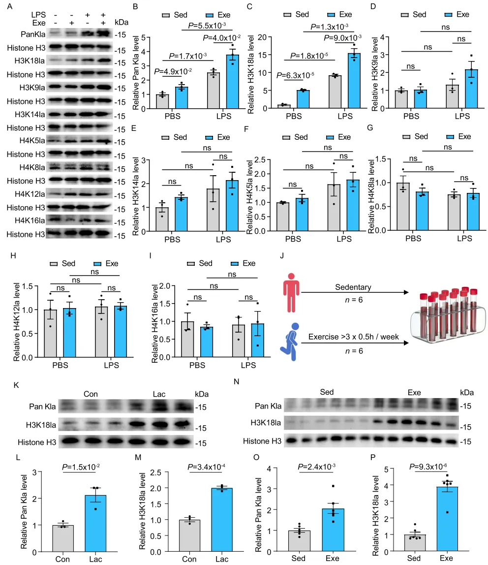 这些观察引出了一个问题:规律运动是否同样促进人体单核细胞 H3K18la。为此,我们招募了缺乏运动与活跃生活方式志愿者(图 7J;表 S3)。鉴于既往研究报道乳酸水平影响组蛋白乳酰化⁴⁰˒⁴⁵,我们将小鼠循环单核细胞暴露于不同浓度乳酸以诱导组蛋白乳酰化,并确定 20 mM 乳酸为最佳浓度(图 S9E、F)。随后,我们以 20 mM 外源乳酸处理缺乏运动志愿者的单核细胞,观察到 Pan Kla 与 H3K18la 水平均升高(图 7K–M)。一致地,活跃志愿者单核细胞中 Pan Kla 与 H3K18la 水平显著高于缺乏运动个体(图 7N–P)。接着,我们考察诱导单核细胞组蛋白乳酰化及其在 SICM 中对心功能产生保护效应所需的运动持续时间。时间序列分析显示:运动 1 天或 7 天的小鼠单核细胞中 Pan Kla 与 H3K18la 水平相当;但在运动 14 天后显著升高,并在运动 28 天后进一步增加(图 S10A–C)。与此一致,运动 14 天可在 LPS 攻击后减轻体重丢失并维持心功能,而延长至 28 天可进一步增强这些保护效应(图 S10D–G)。综上,这些结果表明,运动可在人体与小鼠单核细胞中诱导 H3K18la,并强调其在 SICM 中维持心功能的关键作用。图 7|运动增强人体与小鼠单核细胞中的 H3K18 组蛋白乳酰化对运动(Exe)与缺乏运动(Sed)小鼠在 PBS 或 LPS 注射后 18 h 分离的单核细胞进行 Western blot,以检测多种乳酰化位点,包括 Pan Kla、H3K18la、H3K9la、H3K14la、H4K5la、H4K8la、H4K12la 与 H4K16la(A–I)。组蛋白 H3 作为内参,并标注相对于组蛋白 H3 的灰度定量倍数变化。每组分析 3 份样本,结果来自 3 次独立重复实验。招募缺乏运动与活跃生活方式志愿者的示意图(J)。将人单核细胞与 20 mM 乳酸钠孵育 24 h 后检测 Pan Kla 与 H3K18la 的 Western blot(K–M)。组蛋白 H3 作为内参,并标注相对于组蛋白 H3 的灰度定量倍数变化。每组分析 3 份样本,结果来自 2 次独立重复实验。对人单核细胞进行 Pan Kla 与 H3K18la 的 Western blot 分析(N–P),比较规律运动习惯个体与缺乏运动对照。组蛋白 H3 作为内参,并标注相对于组蛋白 H3 的灰度定量倍数变化。运动通过 p300 与 HDAC2 增强单核细胞 H3K18 组蛋白乳酰化