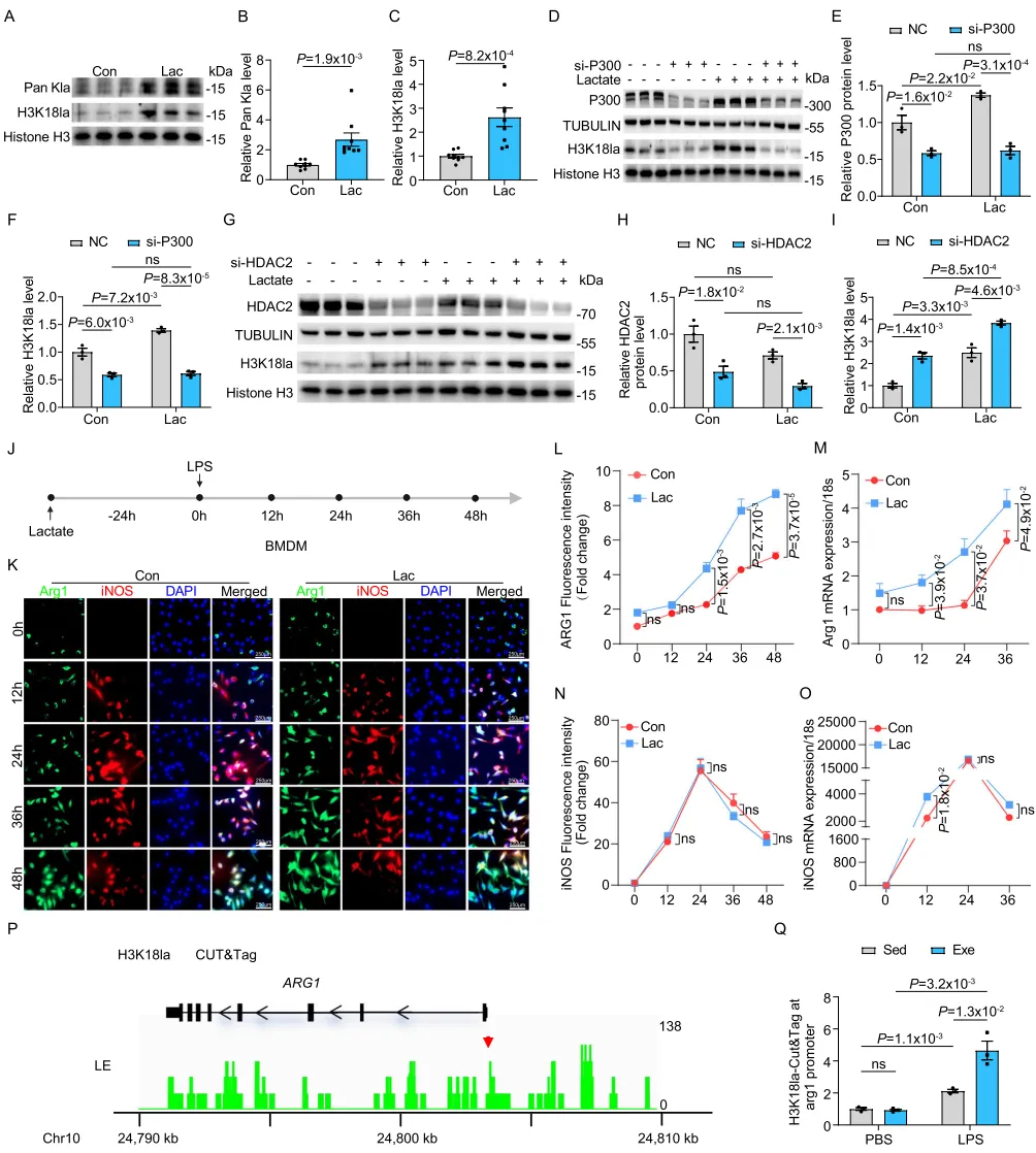 为鉴定负责去除组蛋白乳酰化的去乳酰化酶,我们聚焦于已被报道可能作为组蛋白乳酰化“擦除酶”的 HDAC1–3⁴⁷。我们分别使用 siRNA 沉默 HDAC1、HDAC2 与 HDAC3,并评估乳酸诱导的单核细胞 H3K18la 水平。结果显示,敲低 HDAC2 可显著提高 H3K18la 水平(图 8G–I),而沉默 HDAC1 或 HDAC3 并不会升高 H3K18la(图 S11A–F)。这些结果确定 HDAC2 为单核细胞中 H3K18la 的主要去乳酰化酶。综上,p300 与 HDAC2 分别作为运动诱导单核细胞 H3K18la 的乳酰转移酶与去乳酰化酶,从而参与其在 SICM 中的保护效应。为阐明 H3K18la 是否调控先前观察到的巨噬细胞由 iNOS⁺ 向 Arg1⁺ 加速转变,我们分离骨髓来源巨噬细胞(BMDM)并与乳酸孵育 24 h。经该预处理后,对 BMDM 进行 LPS 刺激的时间序列实验。乳酸预处理显著增强 Arg1 表达而不影响 iNOS 表达,从而促进更快速地向创伤修复型巨噬细胞转变(图 8J–O)。这提示乳酸预处理巨噬细胞有助于在炎症挑战下加速免疫稳态的恢复。为探究 H3K18la 如何调控 Arg1 表达,我们使用抗 H3K18la 抗体进行全基因组 Cleavage Under Targets and Tagmentation(CUT&Tag)分析,并进行高通量 DNA 测序。数据揭示 H3K18la 在 Arg1 启动子区域显著富集(图 8P)。此外,CUT&Tag-qPCR 分析显示,与 PBS 注射相比,LPS 刺激后 Arg1 启动子区域的 H3K18la 富集增加,且在规律运动背景下增幅更大(图 8Q)。综上,这些结果表明,单核细胞中由 p300 与 HDAC2 调控的运动诱导 H3K18la,通过促进更快速向创伤修复型巨噬细胞转变并恢复免疫稳态,从而在 SICM 中介导运动的保护效应。图 8|运动通过 p300 与 HDAC2 增强单核细胞 H3K18 组蛋白乳酰化将小鼠单核细胞与 20 mM 乳酸钠孵育 24 h 后检测 Pan Kla 与 H3K18la 的 Western blot(A–C)。组蛋白 H3 作为内参,并标注相对于组蛋白 H3 的灰度定量倍数变化。每组分析 9 份样本。对小鼠单核细胞分别采用 si-P300(D–F)或 si-HDAC2(G–I)进行 p300 或 HDAC2 敲低,并与 20 mM 乳酸钠处理 24 h,同时设置相应对照组;随后进行 H3K18la 的 Western blot 检测。Tubulin 与组蛋白 H3 作为内参,并标注相对于 Tubulin 与组蛋白 H3 的灰度定量倍数变化。每组分析 3 份样本。骨髓来源巨噬细胞(BMDM)先与 20 mM 乳酸钠孵育 24 h,随后进行 LPS 刺激时间序列实验的流程示意图(J)。乳酸预孵育 BMDM 在 LPS 刺激后的 Arg1 与 iNOS 的代表性图像与定量分析(K、L、N);每组分析 4 份样本。乳酸预孵育 BMDM 在 LPS 刺激后的 Arg1(M)与 iNOS(O)的 RT-qPCR 分析;每组分析 3 份样本。CUT&Tag 分析的代表性轨迹显示 H3K18la 在 Arg1 启动子区域富集(P)。针对 Arg1 的 CUT&Tag 结果通过 qPCR 验证(Q);每组分析 3 份样本。比例尺:250 µm(K)。乳酰化乳酸诱导乳酰化的单核细胞回输可改善 SICM 中的心功能