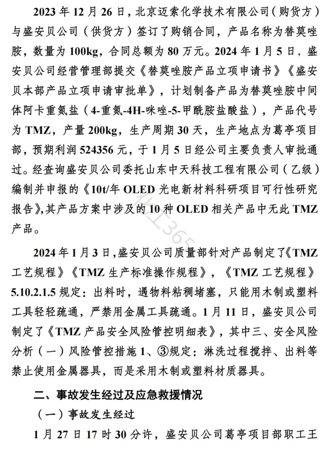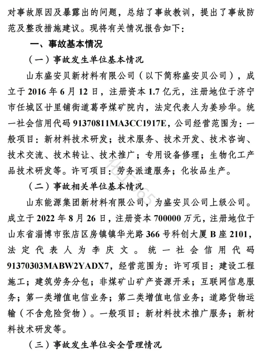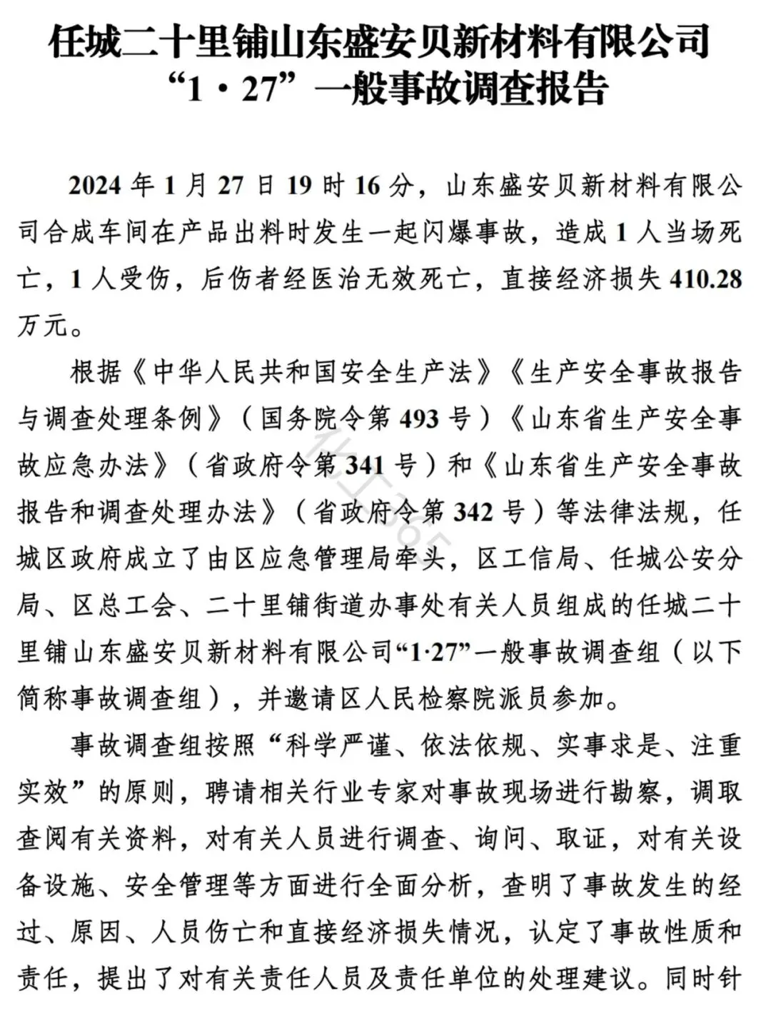 一:事故概述 2024年1月27日19时16分,山东盛安贝新材料有限公司合成车间在产品出料时发生一起闪爆事故,造成1人当场死亡,1人受伤,后伤者经医治无效死亡,直接经济损失410.28万元。