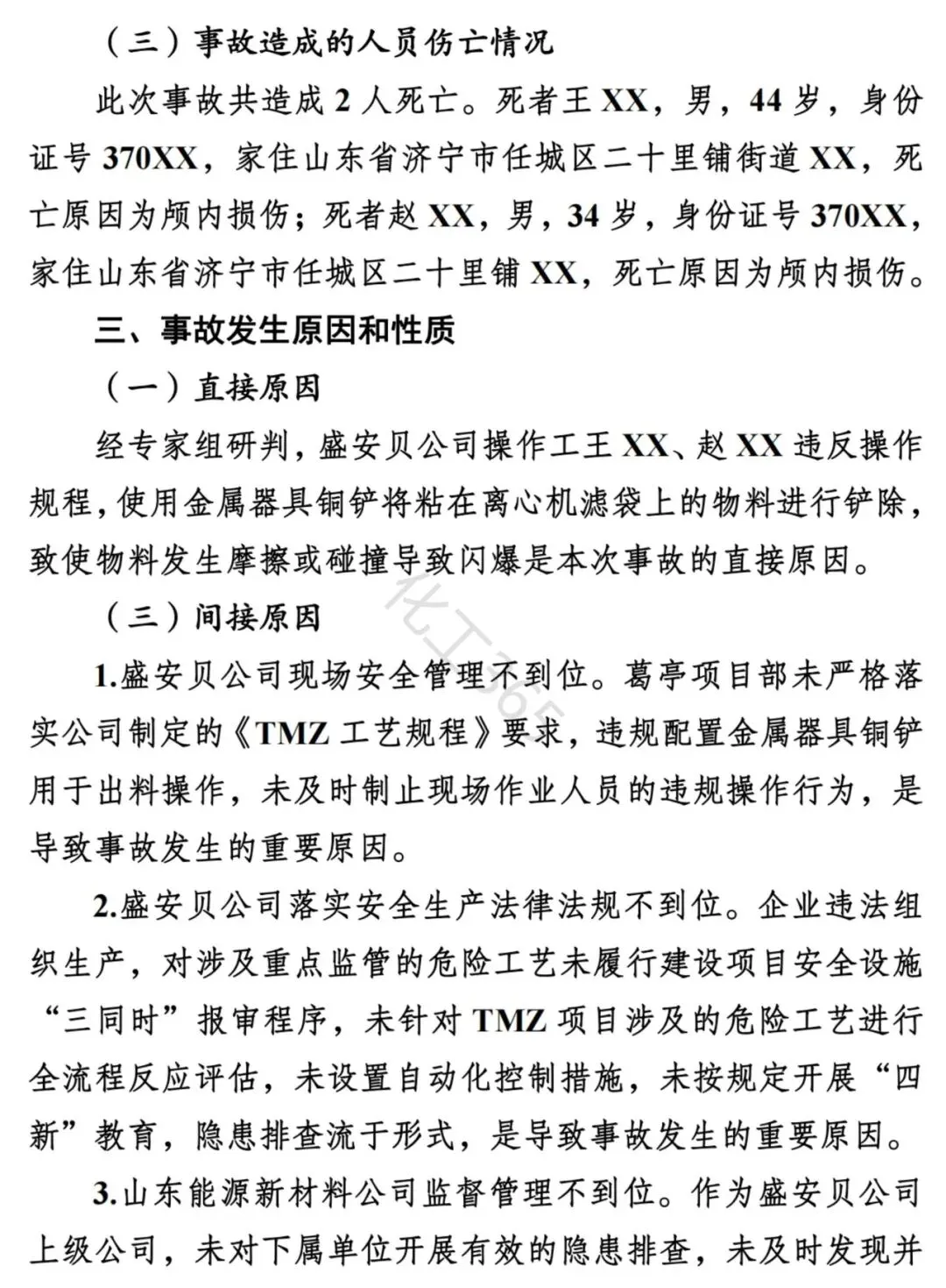 二:直接原因 经专家组研判,盛安贝公司操作工王XX、赵XX违反操作规程,使用金属器具铜铲将粘在离心机滤袋上的物料进行铲除,致使物料发生摩擦或碰撞导致闪爆是本次事故的直接原因。