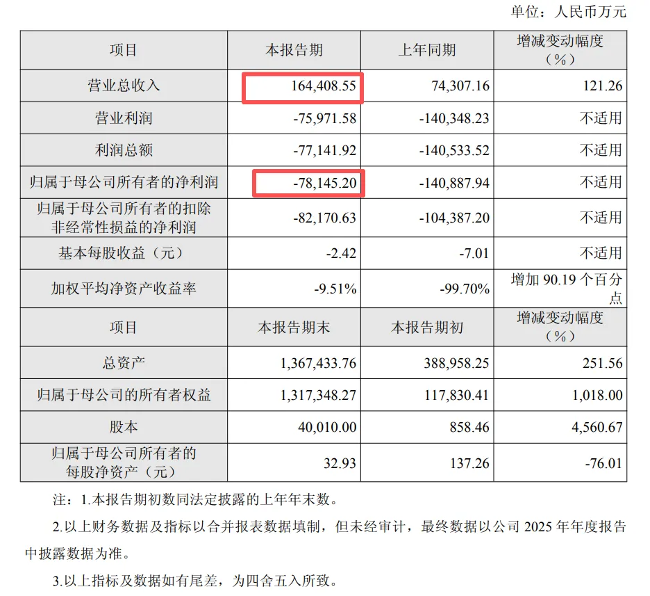 沐曦股份发布业绩快报,2025年实现营业总收入16.44亿元,同比增长121.26%;归属于母公司所有者的净利润亏损7.81亿元,上年同期亏损14.09亿元。