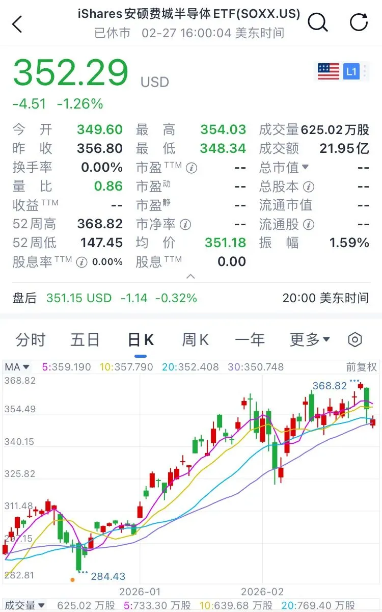 腾讯自选股数据显示,2月27日美股半导体指数ETF(SOXX.US)收盘价格为352.29美元,跌幅为1.26%,总成交量达442.60万股。