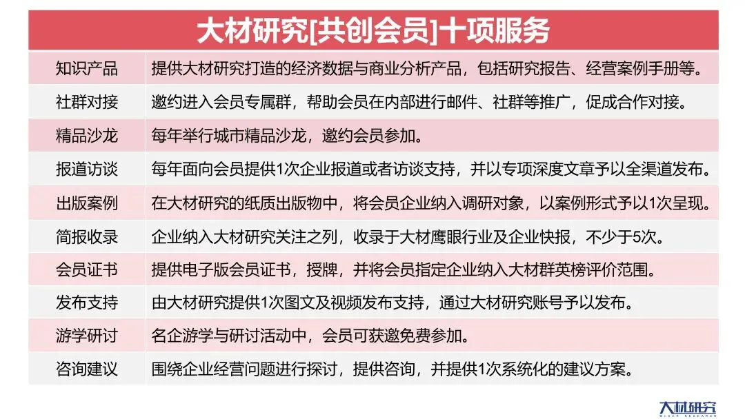 为此,大材研究推出两项智库服务,一是调研与规划,二是共创会员服务,高级赞助商自动获得该项支持。