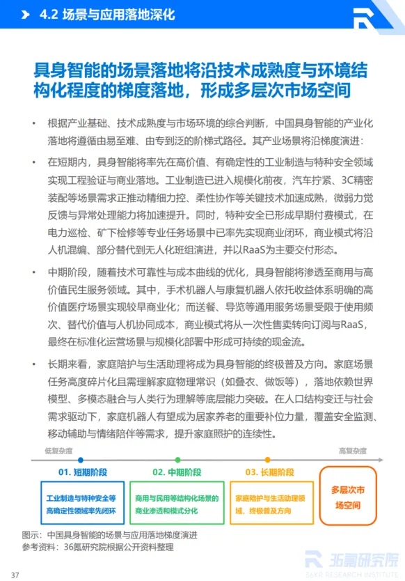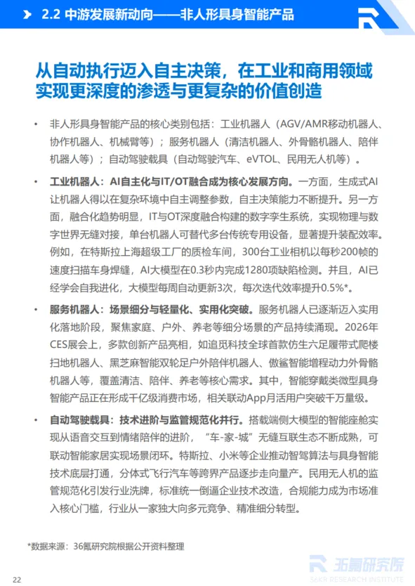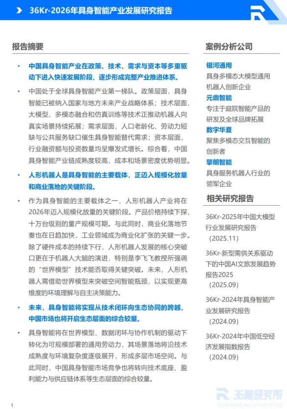 2026年,具身智能(Embodied AI)正站在规模化爆发的临界点上。36氪最新发布的《2026年具身智能产业发展研究报告》为我们揭示了这个赛道的全景图:政策红利、技术突破、资本狂热、场景落地四重奏正在奏响。
