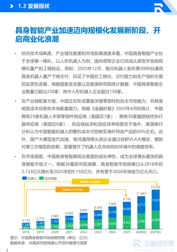 报告测算,中国具身智能市场规模已从2018年的2133亿元增长至2025年的9150亿元,2026年有望突破万亿元大关。