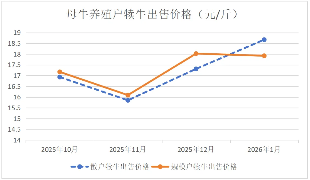 (2)母牛养殖户犊牛出售数量和价格均上涨。1月份母牛养殖散户出售犊牛42头,环比增加110%,出售价格平均为18.67元/斤,环比增长8%;20头以上规模户出售犊牛79头,环比增长8%,出售价格平均为17.92元/斤,环比下降0.6%(见图2)。上述现象传递了母牛养殖效益和信心逐步好转的信息。