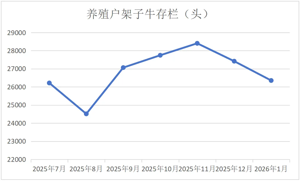 架子牛存栏持续下降:1月监测户架子牛存栏总量为26351头,环比下降4%。值得注意的是,这是继2025年12月份的进一步下降(见图3)。主要原因是1月份新购进犊牛数量减少。监测户新购买犊牛2409头,环比下降了45%。68%的架子牛监测户进行了补栏,仍有32%的监测户处于减少存栏或没有补栏的状态。这些现象表明,大部分养殖户看好未来产业发展,但部分养殖户对于架子牛养殖仍然信心不足。