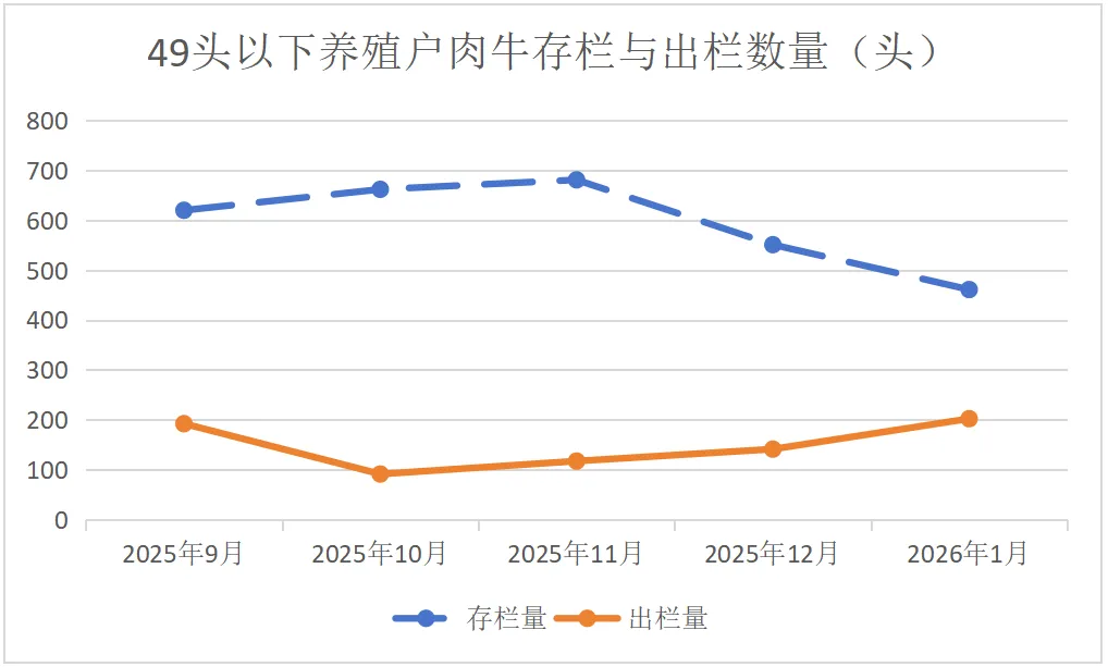 图4.育肥户(49头以下)肉牛存栏与出栏变动情况