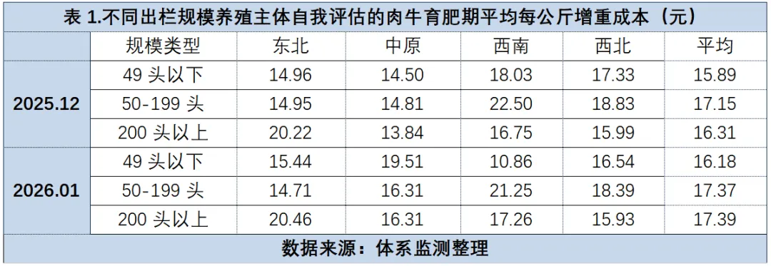 (5)育肥牛交易价格进一步上涨: 1月份监测市场上育肥牛出售价格平均约为28元/公斤,环比上涨1.9%,值得注意的是,这个价格上涨是继2025年12月份价格上涨后的进一步上涨;交易月龄平均为22.02个月,环比增加3.3%;交易体重平均为1322.61斤/头,与上月相比基本持平。育肥牛体重没有增加但月龄增加,表明育肥主体看好春节市场,出售日期延迟。