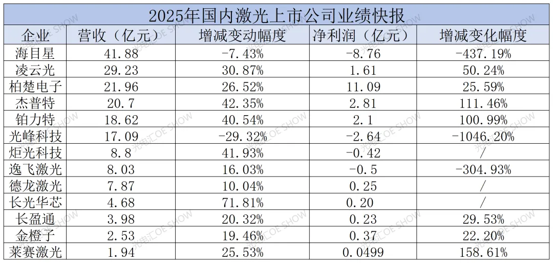 一天之内,十余家激光上市企业几乎在同一时间窗口内,密集披露了2025年度业绩快报:有人营收利润双双暴涨;有人深陷亏损业绩承压;也有人虽未盈利,却已看到黎明的曙光。