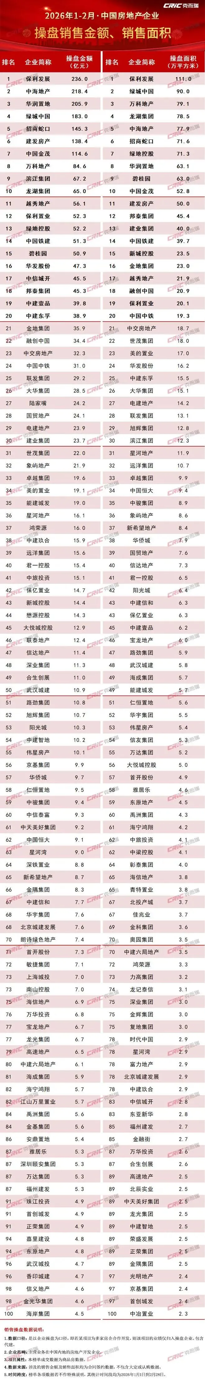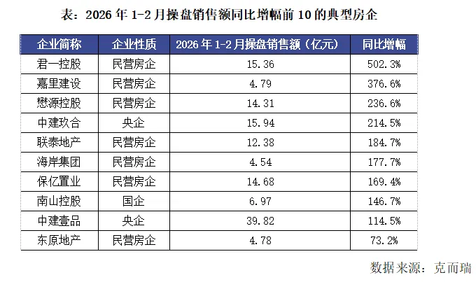 从企业具体表现来看,2026年2月典型房企中累计业绩同比增长企业共有29家,销售额同比增幅前10的企业中7家是中小民营房企。在房企整体业绩筑底的背景下,这些企业仍保持着较为稳健的运营。