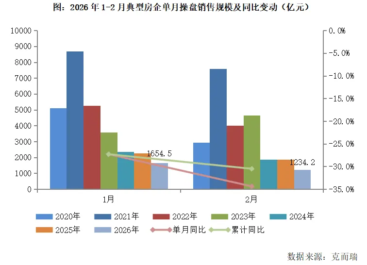 2026年2月,典型房企实现单月销售操盘金额1234.2亿元,前2个月累计实现销售操盘金额2888.7亿元。