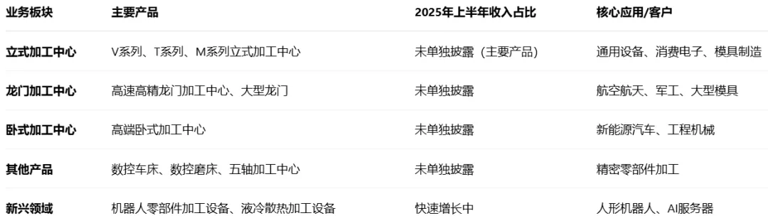 主营业务为数控机床的研发、生产和销售,主要产品包括立式加工中心、龙门加工中心、卧式加工中心等八十多种品类。产品广泛应用于汽车、新能源、工程机械、航空航天、消费电子、半导体等众多行业。