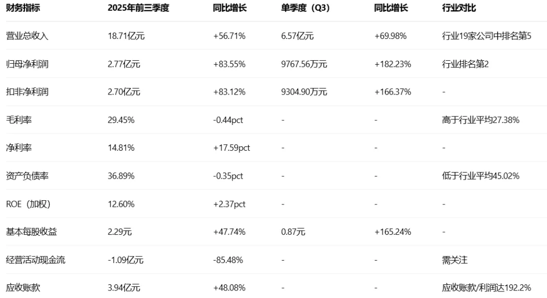 公司2022-2025年营收从15.48亿元增长至2025年前三季度的18.71亿元(全年预计超24.95亿元),净利润从1.93亿元增长至2025年前三季度的2.77亿元(全年预计3.43亿元)。毛利率保持在29%以上,盈利能力稳定。