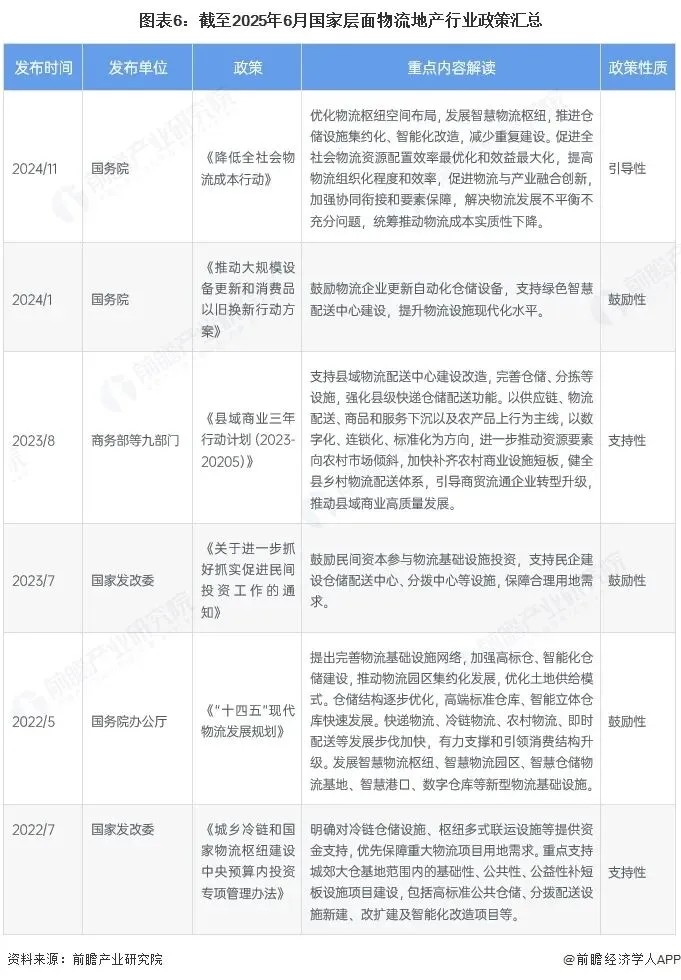 中国物流地产领域国家级政策聚焦基础设施升级与降本增效两大主线。政策持续推动物流枢纽网络化布局,强化国家骨干冷链基地、陆港空港枢纽的土地要素保障和资金支持,鼓励高标仓、智能化仓储设施建设。同时着力优化土地供给模式,通过中央预算投资专项引导冷库、多式联运设施等现代化改造。政策明确要求发展绿色物流,支持仓储屋顶光伏应用和节能建筑推广,并鼓励民间资本参与物流园区投资。近年更加强调县域配送中心建设及设备更新,通过智慧化、集约化手段降低全社会物流成本,构建覆盖城乡的高效物流体系。各部委政策在用地保障、技术升级和绿色转型方面协同发力。国家层面物流地产行业政策汇总如下: