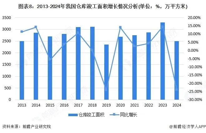 仓库是物流地产的重要组成部分,主要用于货物的存储、保管和维护。从仓库竣工面积来看,2013-2024年我国仓库竣工面积波动变化,2020年以来,我国仓库竣工面积大幅回升,2022年我国仓库竣工总面积达到2878.97万平方米,同比增长4.33%;2023年仓库竣工面积持续增长,增速达14.49%,较2022年增加10.16个百分点,竣工面积达3296.12万平方米。根据国家统计局数据显示,2024年我国仓库竣工面积2508万平方米,同比下降幅度较大,为24%。