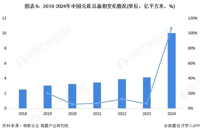 据物联云仓每年末统计的全国通用仓储面积,2018年至2023年,我国通用仓库面积持续增长,由2.54亿平方米增长至4.12亿平方米;2024年,我国通用仓储总面积约为10亿平方米。比2023年增加5.17亿平方米,翻了一倍有余。