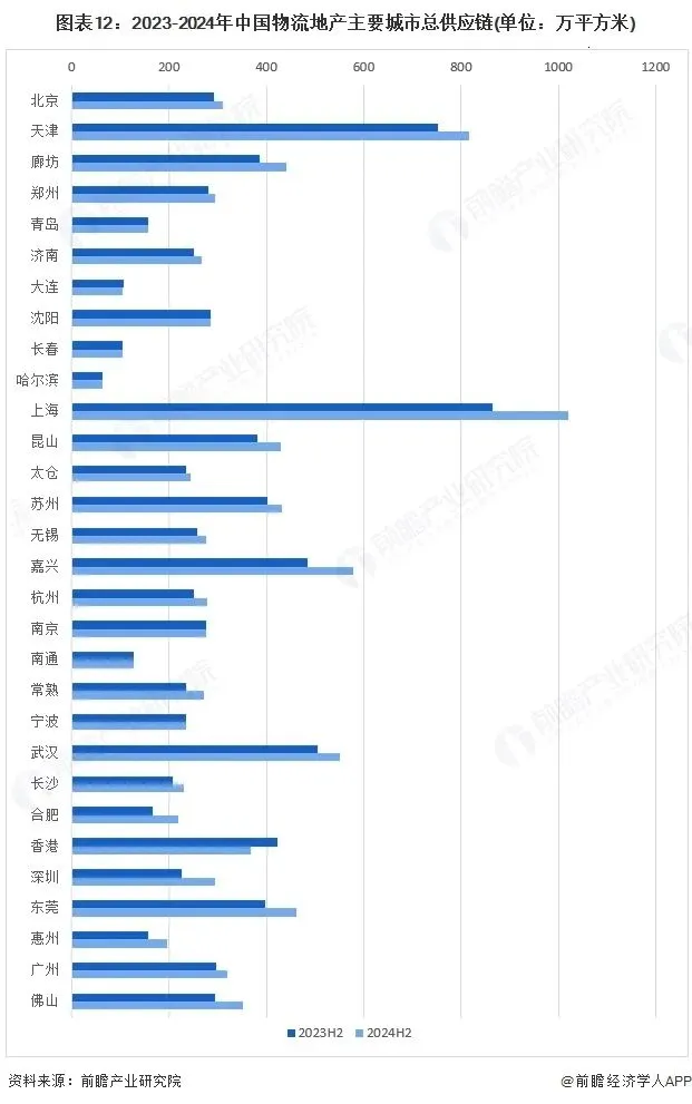 近年来,中国物流地产租金随着物流地产供需发生着相应的变化。随着中国经济增长模式从出口转向内需,带动了电商的蓬勃发展,此前被电商冲击得相当厉害的国内传统批发及零售商贸企业,也开始拓展自身的电商业务应对冲击,这些业务的拓展都离不开对物流地产的大量需求。2024年下半年,租金地图29个核心物流城市总供应量9643万平方米。其中总供应量超过300万平方米的的城市有11个,400万以上的8个,500万以上的4个。排名前三的上海、天津和嘉兴均超过550万平方米,上海更是第一个突破1000万平方米的城市。