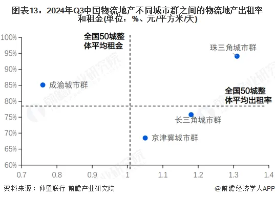 受益于跨境电商驱动,珠三角城市群呈现供需两旺;长三角城市群需求未减弱,但短期供给过剩导致短期存在去化压力;京津冀城市群需求较弱导致中短期存在去化压力;成渝城市群供需相对平衡。