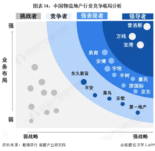 目前。我国的物流地产行业竞争格局主要由物流地产商、传统房地产企业、电商企业、快递物流企业、金融机构五方构成;头部企业是普洛斯,行业市场份额为接近三成;领导者还有万纬、宝湾;强表现者有易商、、安博、宇培、丰树、嘉民深国际、京东等。竞争者有东久新宜、平安、菜鸟、乐歌、第一地产等。