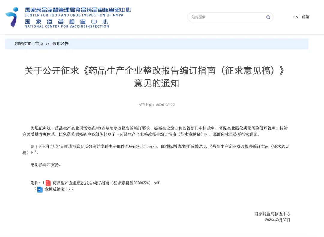关于公开征求《药品生产企业整改报告编订指南(征求意见稿)》意见的通知,