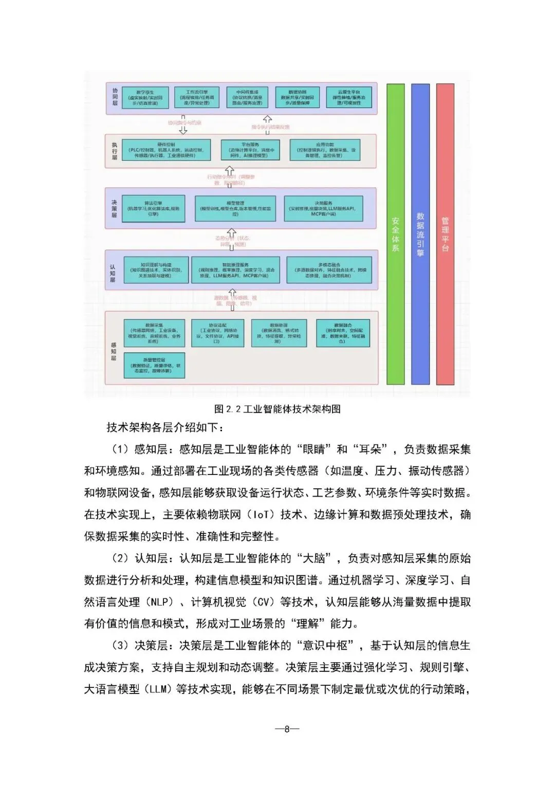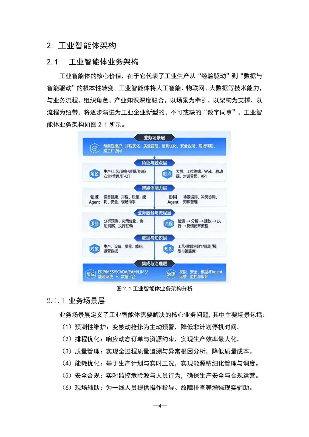 核心架构与关键技术:报告构建了包含业务、技术及安全三层的完整架构体系。其中,业务层贯通“业务场景-角色触点-智能能力-服务流程-数据知识-集成治理”六大层次。技术层则围绕“感知-认知-决策-执行-协同”五层闭环,依赖工业物联网、知识图谱、机器学习、强化学习及数字孪生等关键技术实现系统智能。