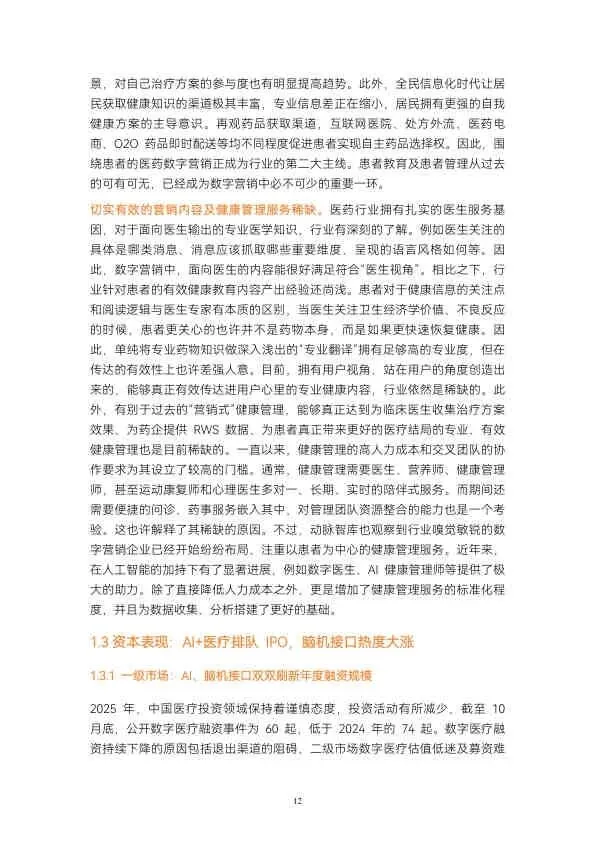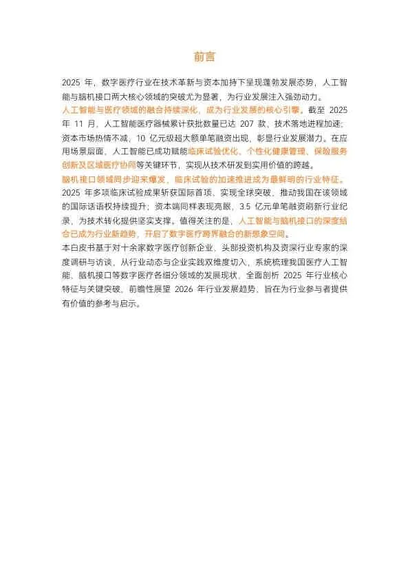 2025年,中国数字医疗行业在政策、技术和资本的三重驱动下,迎来了以“人工智能”和“脑机接口”为双引擎的爆发式增长。行业重心已从技术探索全面转向场景落地与商业化验证。AI大模型正深度赋能医疗全链条,而脑机接口则在临床试验上取得里程碑式突破。展望2026年,技术融合(如AI+脑机接口)、场景下沉(如基层医疗、主动健康管理)和产业链协同(如数据资产化、国产化替代)将成为推动行业迈向新阶段的关键趋势。