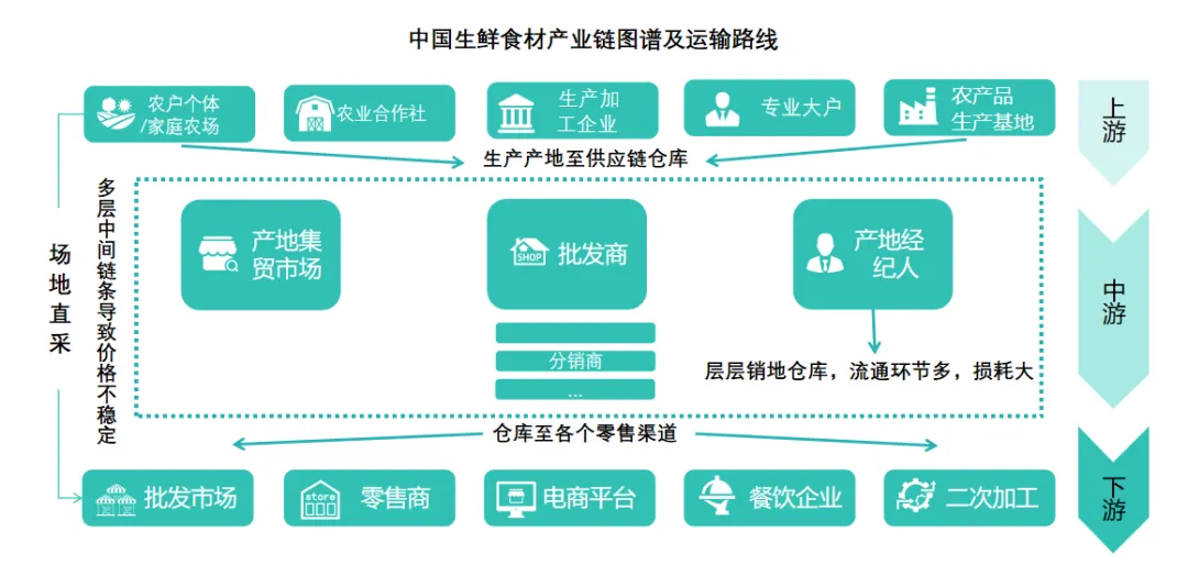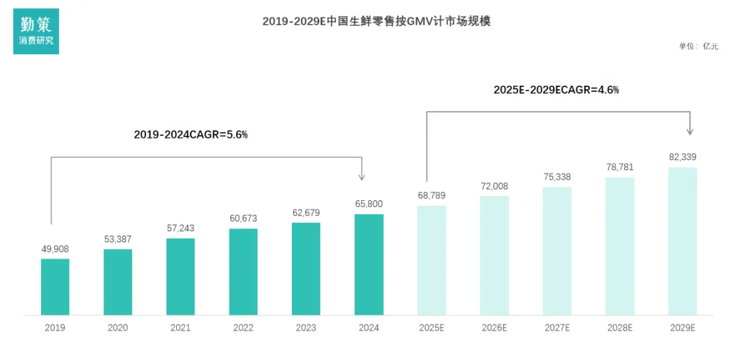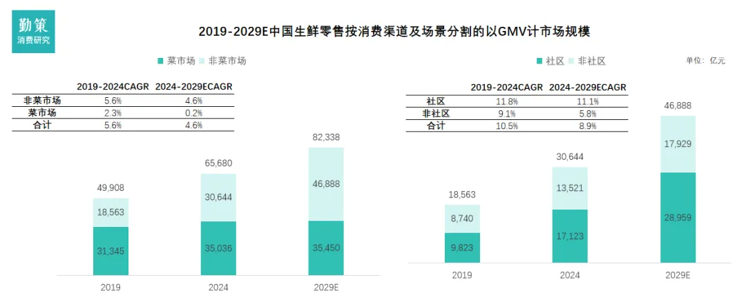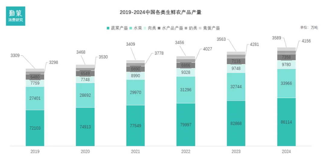 根据灼识咨询的资料,近年来中国生鲜零售市场发展迅速。中国生鲜零售市场的市场规模(按GMV计)自2019年的人民币49,908亿元增长至2024年的人民币65,680亿元,复合年均增长率为5.6%。在可支配收入及购买力不断提升、消费者对生活质量和健康饮食的需求持续增长、零售渠道不断丰富及供应链技术不断发展、一系列促进农业农村现代化及食品安全等鼓励政策持续出台的驱动下,中国生鲜零售市场仍有进一步增长的巨大潜力。得益于消费升级与渠道革新。非菜市场渠道(特别是生鲜电商和社区超市)的快速增长,源于其通过数字化供应链、前置仓模式提升了效率与便利性,精准匹配了都市快节奏生活需求。而社区场景以近10%的年增速成为核心引擎,则直接反映了“一刻钟便民生活圈”政策的推动以及消费者对即时性、近场化消费的强烈偏好。中国生鲜市场的市场规模将于2029年进一步增长至人民币82,339亿元,自2024年起预测的复合年均增长率为4.6%。非菜市场的生鲜零售市场可进一步按照消费场景分为社区及非社区场景。2024年,近60%的生鲜产品零售在社区场景中完成,构成生鲜产品消费的主流。消费者在社区场景中,可以通过社区生鲜连锁门店、社区团购、即时电商(前置仓和前置店)、以及位于社区的未登记夫妻店等渠道购买生鲜产品,消费渠道丰富多样。非社区场景主要包括超市及大型卖场,以及传统电商。未来中国生鲜零售市场将呈现结构性转型,增长主要由非菜市场渠道(如生鲜电商、社区超市)和社区消费场景共同驱动,其中社区场景以近两位数的年增速成为核心引擎,推动市场向便利化、近场化发展,而传统菜市场渠道增长近乎停滞,整体市场在增速放缓中趋于成熟,竞争焦点转向运营效率与用户体验。传统生鲜食材供应链链条长,供应链信息不对称,同时存在产销脱节、信息化程度低等问题,市场需求与供给不匹配。近年来,中国生鲜市场正通过供应链数字化、冷链物流升级和产地直销等优化方案,向短链化、集群化转型。但需解决区域差异、标准化和可持续性等挑战。根据国家统计局数据显示,2019年至2024年期间,中国主要生鲜农产品产量保持全面增长。六大类品类总产量从约12.7亿吨提升至近13.5亿吨,增长态势稳定。蔬菜与水果始终是核心构成,2024年两者产量合计占比再次超过80%,保障了基础供给。奶类产品增长最为显著,六年间增幅约23%,反映出消费升级的需求拉动。肉类、水产品及禽蛋产量也实现稳步提升,供给结构持续优化。这些数据表明上游生产端正在朝着更丰富、更高质量的方向发展。产量的全面增长与零售渠道碎片化(社区化、线上化)相结合,说明中国生鲜市场正在从“总量保障”向“质量提升与精准配送”的高阶阶段演进,下游渠道的激烈竞争背后是上游供给的强力支撑。各级渠道之间存在信息不对称,加之生鲜具有单价低、易腐烂、地域性强的特点,供应链上各级渠道因供需发现和风险分摊的功能而存在。冗长的供应链大大降低了生鲜农产品的流通效率,并且因为中国生鲜农产品冷藏运输率距发达国家仍有一定差距,生鲜农产品的耗损问题十分严重。受限于上游生产与中游批发市场较为分散,批发商们无法规模采购,降低成本,最终造成较高的流通成本和终端售价。高昂的流通成本会逆向引发流通半径小、农户收购价过低、终端品质不一、甚至滞销等问题。5、下游:生鲜零售进入社区化“多极化共存”时代