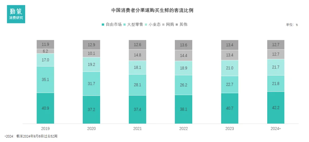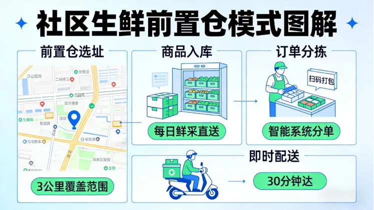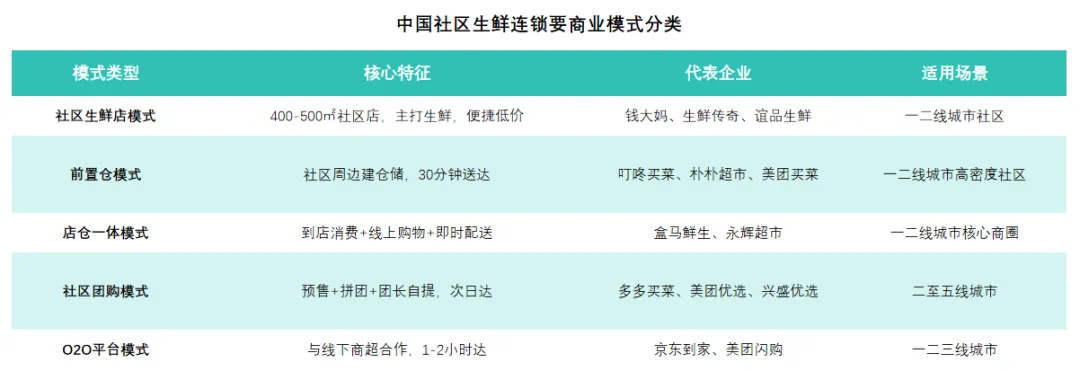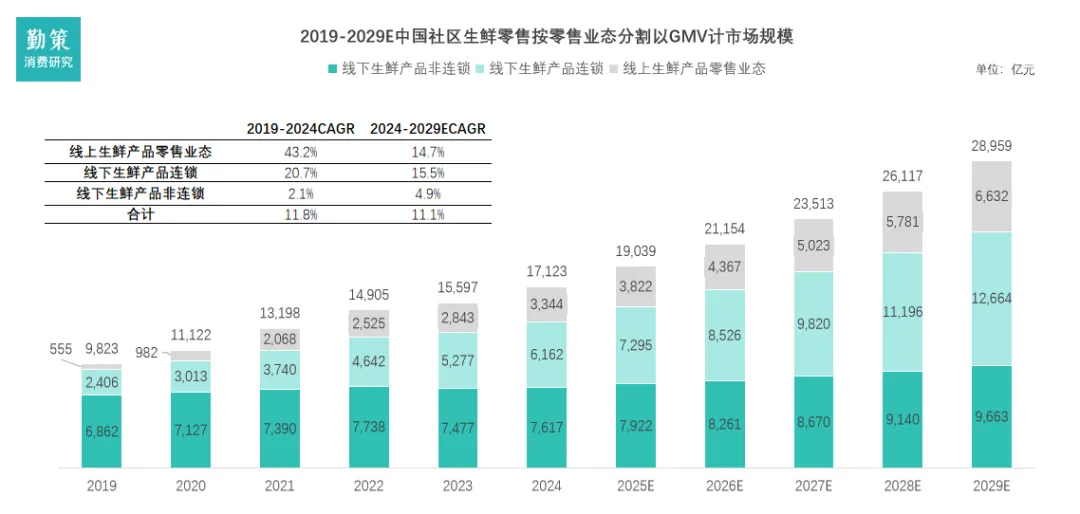 生鲜零售正告别单一模式颠覆的时代,进入一个基于不同场景与价值主张的“多极化共存”新常态。竞争的核心已转向如何在社区生活圈内,更高效地满足消费者对即时性、体验感与性价比的综合需求。2019年,传统农贸市场与大型商超合计占据近八成市场。但到了2024年,格局已然重构:大型商超份额流失超过13个百分点,萎缩超三分之一,受到社区店便利性与线上平台价格优势的“双向挤压”。而农贸市场则在波动后强劲复苏,份额反超疫情前水平,印证了其感官挑选、灵活议价和社交属性等固有价值的回归。其让出的份额主要流向了贴近社区的“小业态”,这表明生鲜消费的核心战场已明确转向即时、近场的社区圈。二、中国社区生鲜行业概览:八成生鲜市场在线下,连锁化趋势明显社区生鲜零售是以社区及周边1-3km居民为核心客群,依托线下门店(含前置仓)与线上渠道(小程序、APP、社群等),提供高频刚需生鲜产品及便民日用品,通过"最后一公里"近场服务满足即时性消费需求的零售业态。社区生鲜连锁按照商业模式可细分为社区生鲜店模式、前置仓模式、仓店一体模式、社区团购模式、O2O平台模式。近年来,虽然以社区团购和即时电商为代表的线上生鲜业态凭借便捷性实现了爆发式增长,但线下业态在2024年仍占据约80%的市场份额,保持绝对主流地位。这是由于生鲜产品高度依赖体验与即时决策,线下渠道能让消费者直接评估品质、按需挑选,形成了线上难以替代的核心优势。在这一庞大线下基本盘中,市场结构正持续优化:品牌连锁店通过标准化运营稳健扩张,而非连锁的传统夫妻店则面临增长压力,推动行业连锁化率预计从2024年的44.7%提升至2029年的56.7%,标志着线下赛道正走向更集约化、品牌化的发展阶段。前置仓模式是一种零售履约解决方案,其核心在于将小型、数字化的仓储节点(即前置仓)提前部署在离消费者最近的社区周边(通常3公里范围内)。这些仓库不对外开放营业,专门用于接收线上订单,并作为即时配送的起点,从而实现商品在30-60分钟内极速送达消费者手中。三、中国社区生鲜竞争格局:"大市场、小龙头"碎片化竞争与渐进式整合中国社区生鲜连锁行业呈现"大市场、小龙头"的分散格局,2024年市场规模达1.7万亿元,但前五大企业合计市占率仅7.3%,连锁化率不足45%。