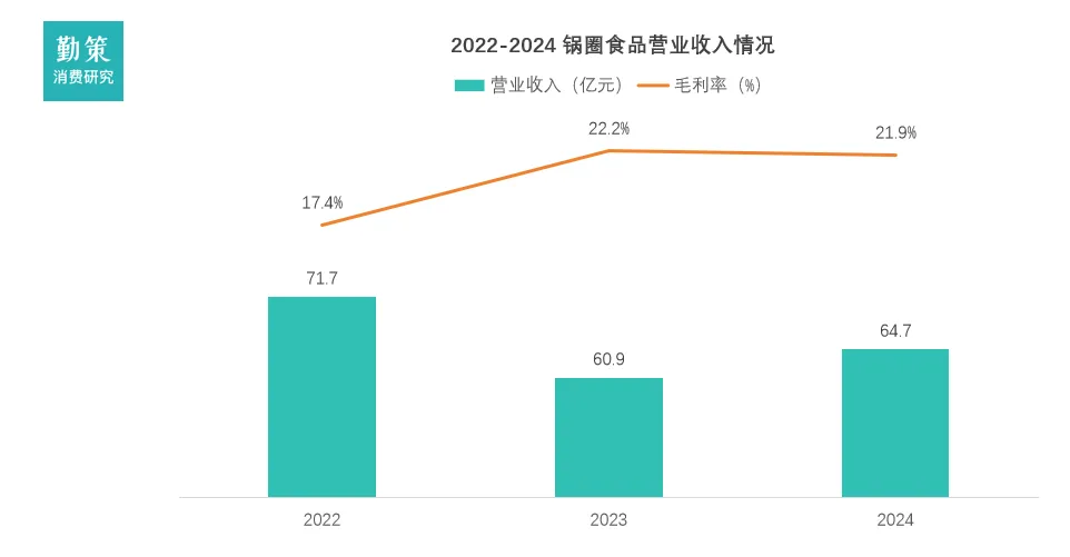 钱大妈的“折扣日清模式”是其商业模式的核心运营机制与关键增长引擎。该模式通过严格的阶梯降价规则(每晚七点起每三十分钟降价一折,至十一点半剩余商品免费送出),强制实现生鲜商品“当日到货、当日售罄”,从根本上解决了行业高损耗与库存管理的核心痛点。这一设计在运营层面实现了零库存周转,显著提升了供应链效率;在消费者端建立了“绝对新鲜”的品牌认知与高性价比形象;在加盟端则通过流程标准化大幅降低了运营复杂度与入局门槛,驱动了门店网络的快速复制与规模化扩张。本质上,该模式通过牺牲部分毛利,系统性换取了库存周转效率、品牌差异化及扩张速度,构成了企业在生鲜零售赛道可持续的竞争优势基础。锅圈在2022年至2024年期间,呈现出“营收波动调整、毛利率显著提升”的阶段性发展特征。公司营收从2022年的71.7亿元回落至2023年的60.9亿元,降幅明显,2024年虽小幅回升至64.7亿元,但仍未恢复至2022年水平。
