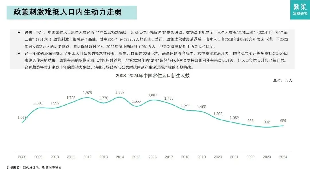 近年来,中国常住人口新生人数经历了冲高后持续探底的波动,2023 年触及 902 万人的历史低点,2024 年虽小幅回升至 954 万人,但仍处于历史低位区间,人口内生动力走弱成为行业发展的外部挑战。