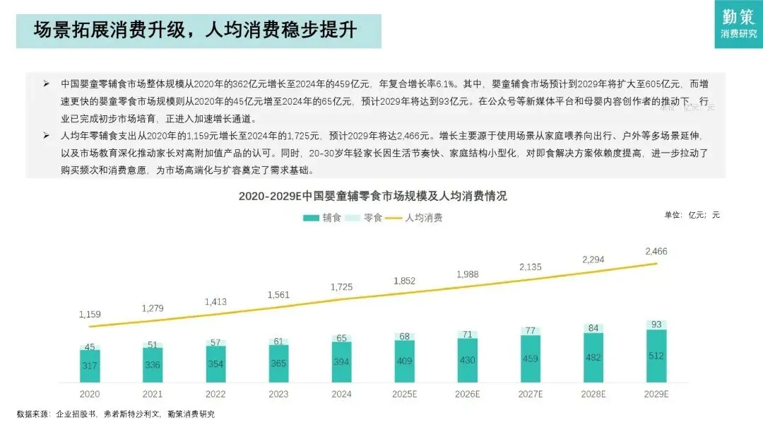 人均年零辅食支出同步攀升,从2020年的1159 元增至2024年的1725元,2029年预计达2466 元。