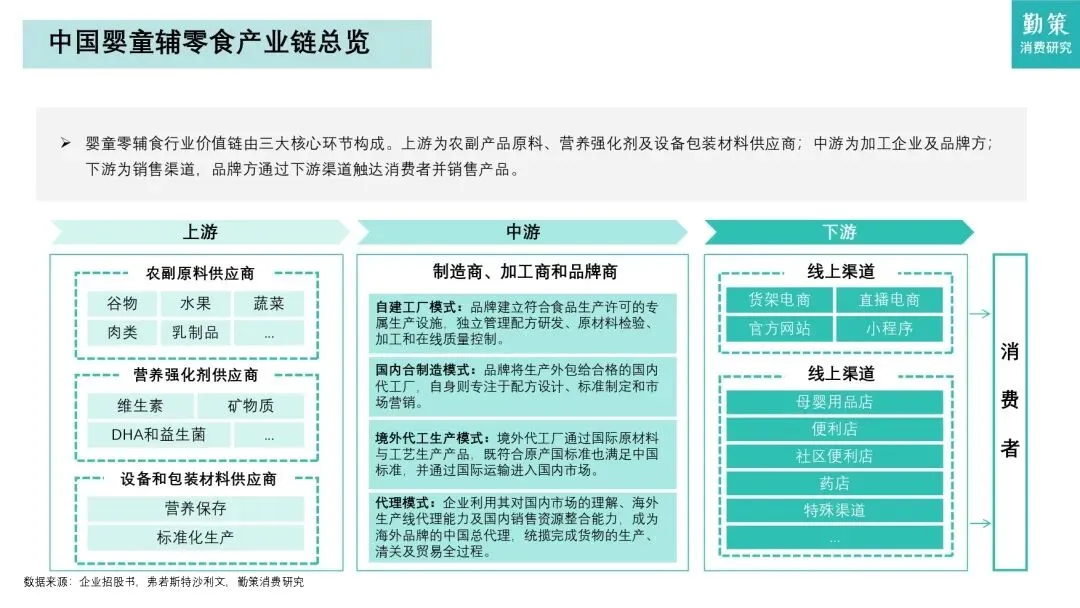 中国婴童零辅食产业链已完成从 “基础保障” 到 “科学精细” 的转型,上游原料供给趋稳、中游生产研发升级、下游渠道融合创新,全链路的精细化运营成为行业发展的核心支撑。