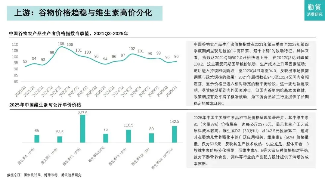 上游环节呈现 “谷物稳、维生素分化” 的特征,为下游生产提供稳定的成本环境。2021Q3-2025Q4,中国谷物农产品生产者价格指数冲高回落后趋于平稳,2024 年后在 94.0 至 102.4 区间窄幅震荡,国内谷物供给基本面稳健;维生素作为核心营养强化剂,2025 年市场价格呈现显著分化,B 族维生素因生产工艺、原料成本等因素价格偏高,维生素 A、E 等大宗品种价格平稳,为企业产品配方设计提供了清晰的成本依据。