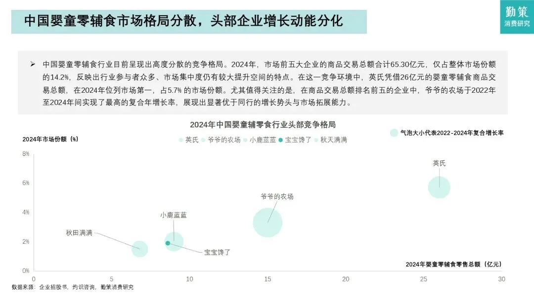 中国婴童零辅食行业目前呈现高度分散的竞争格局,2024年市场前五大企业商品交易总额合计65.30亿元,仅占整体市场份额的14.2%,行业参与者众多、集中度提升空间较大,成为中小品牌突围的重要机遇,同时头部企业的增长动能呈现显著分化,竞争逻辑从规模扩张转向价值深耕。