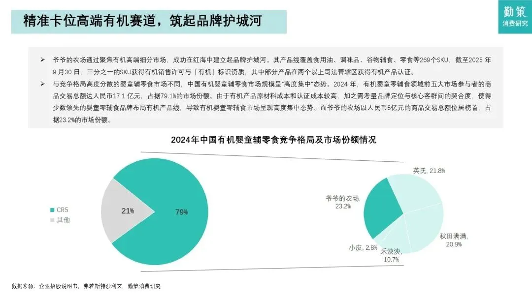 有机婴童零辅食市场成为头部企业的必争之地,与整体市场的分散格局不同,该细分市场呈现高度集中特征,2024年前五大企业占据79.1%的市场份额,英氏、爷爷的农场、禾泱泱位列前三。有机产品的原材料成本、认证成本较高,对品牌定位与核心客群契合度要求严苛,成为行业进入壁垒,也为头部品牌构筑了竞争优势。