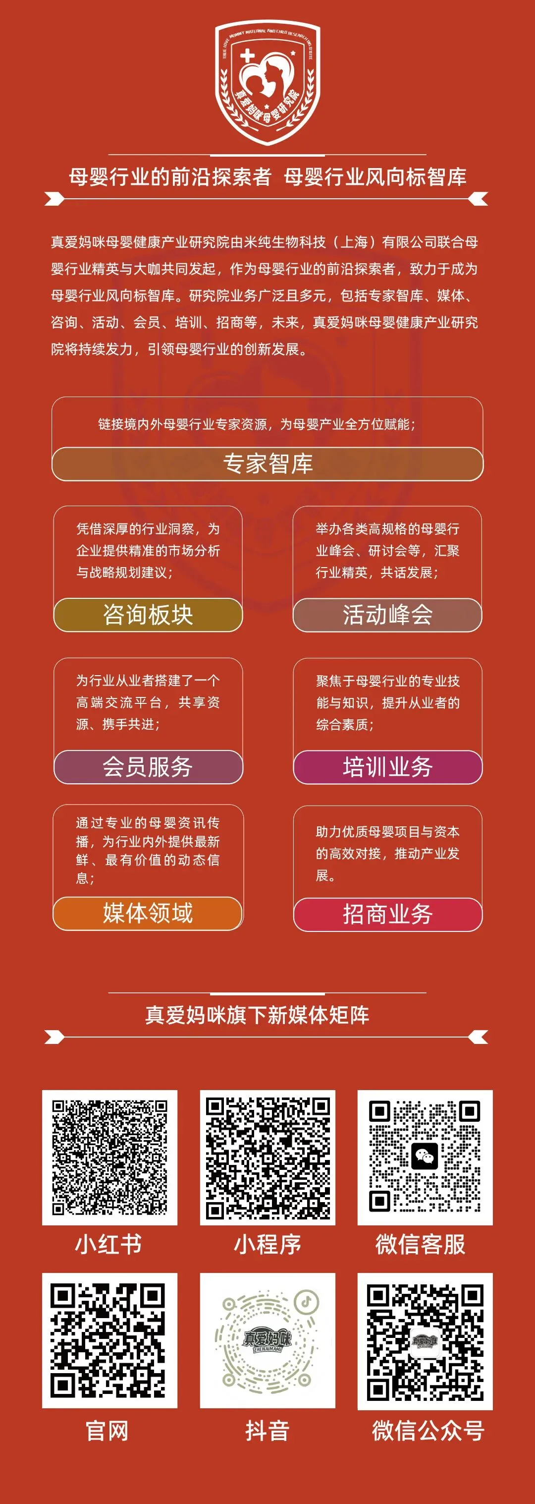 真爱妈咪母婴健康产业研究院由米纯生物科技(上海)有限公司联合母婴行业精英与大咖共同发起,作为母婴行业的前沿探索者,致力于成为母婴行业风向标智库。研究院业务广泛且多元,包括专家智库、媒体、咨询、活动、会员、培训、招商等,未来,真爱妈咪母婴健康产业研究院将持续发力,引领母婴行业的创新发展。
