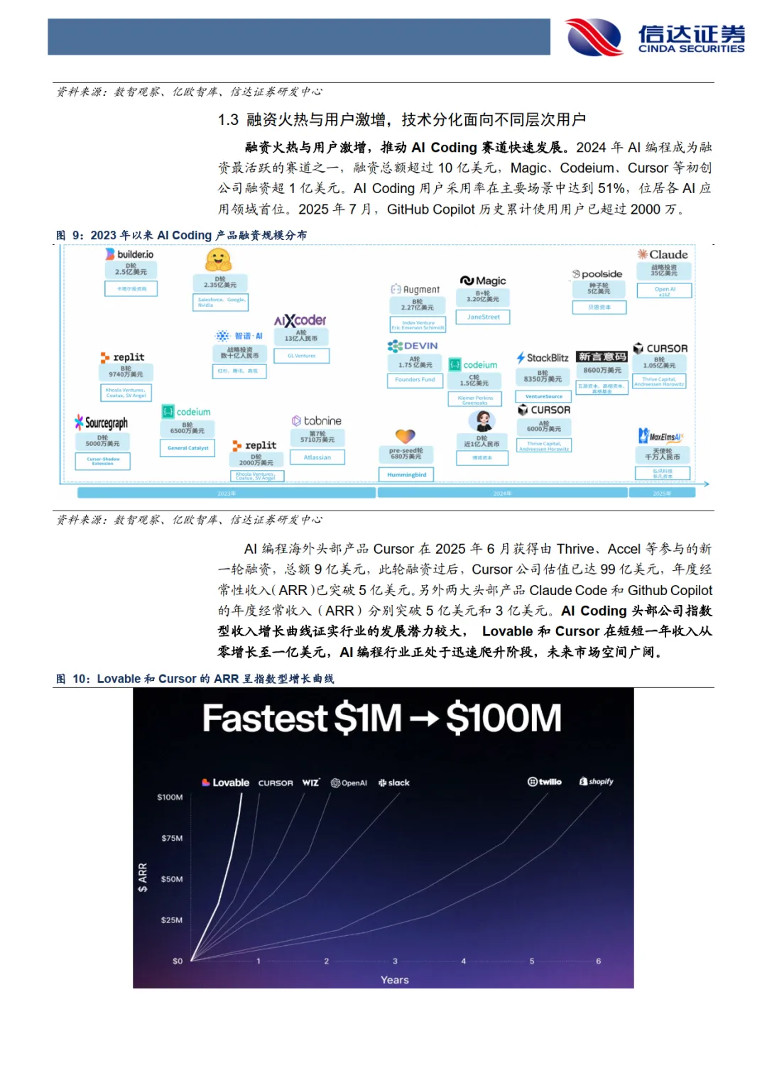 AI 编程海外头部产品Cursor 在2025 年11 月获得总额23 亿美元的融资,估值已达293 亿美元;另外两大头部产品Claude Code 和Github Copilot 的年度经常收入(ARR)分别突破5 亿美元和3 亿美元。1)其中,Github Copilot 凭借其优秀的平台生态,积累大量开发者群体和构建强大开发生态,截至微软2024 财年第三季度,GitHub Copilot 付费用户数量进一步跃升至180 万,同比增长率超过35%;2025 年7 月末,GitHub Copilot 累计用户突破2000 万。2)Cursor 验证“IDE+AI”道路集合的成功,通过免费版本吸引客户,以付费版本实现商业化,2025 年11 月,Cursor 年化收入突破10 亿美元,被超过5 万家企业选择。