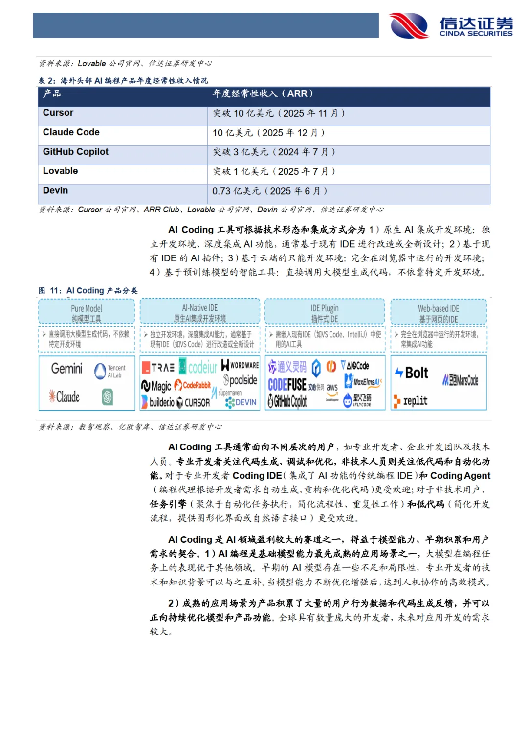 国内各大互联网厂商积极布局AI Coding 赛道,其中字节推出AI 原生集成开发环境Trae IDE,阿里推出聚焦于本地化的通义灵码,两家厂商的AI Coding 工具分别基于各自的大模型产品豆包和通义千问作为底层技术。1)字节Trae:是一个高度集成AI 大模型,基于VS Code 构建,主打AI+IDE 的代码开发模式,主要功能包括Builder、Chat 模式、CUE 智能编程工具以及内置智能体SOLO Coder。截至2025 年末Trae 全球范围内收获了超过600 万用户,覆盖全球近200 个国家和地区,月活突破160 万。2)卓易信息Snapdevelop 和EasyDevelop:Snapdevelop 是一款低代码集成开发环境(IDE),主要支持.NET 平台的云原生开发,在云原生领域具有明显优势,低代码属性可使得开发效率提升3-5 倍。主要面向专业开发者以及企业级开发人员,具备完整的开发环境IDE。商业化开启,截至2025H1 已拥有超过2 万试用用户,2026 年1 月发布专业版定价2660 元/人*年;EazyDevelop 是以AI+IDE 和多智能体为基底的集成开发平台,截至2025 年底,Eazydevelop 平台用户已突破1.3 万,订单金额突破1800 万。