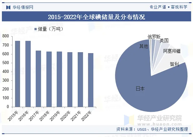 世界上主要的碘储量国包括智利、日本和美国,五家智利公司约占全球碘总销售额的58%,八家日本碘生产商约占全球碘销售额的26%,美国的碘生产商占世界碘销售额的近5%,合计占比约89%。此外,俄罗斯、土库曼斯坦、阿塞拜疆、印度尼西亚和中国也生产少量的碘。智利的碘主要从硝石矿中提取,在生产硝酸盐的过程中,将碘从硝酸盐矿中分离出来;日本、美国等国家的碘主要来源于在开采石油、天然气的同时取得的卤水;我国的碘主要来源于海藻、磷矿。