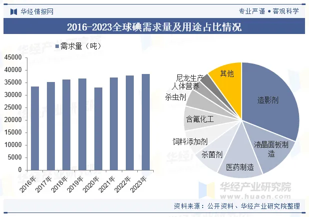 碘广泛用于医疗、农业和工业应用以及人类和动物营养产品,碘及其化合物常用作产品配方中的原料或催化剂,例如X射线造影剂,杀菌剂,防腐剂和消毒剂,医药中间体,LCD和LED屏幕的偏光膜,化学品,有机化合物和颜料。碘也以碘酸钾或碘化钾的形式添加到食用盐中,以防止缺碘症。随着全球精细化工产业的不断发展,市场对碘的需求整体呈现不断上涨的态势,据统计2023年全球碘需求量约为3.86万吨,在碘的下游用途中,X射线造影剂、医药制造、液晶面板制造是主要应用,合计约占57%。